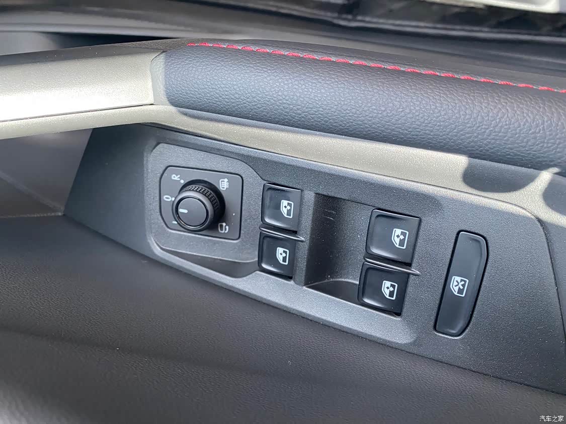 中控台部分是皮质,带红色缝线,质感还是不错的,,还有车门板和扶手也是皮质带红色缝线