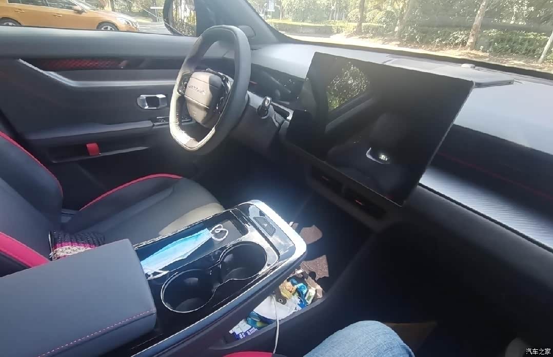 及简的内饰,很少的物理按键,我个人不是很喜欢,但由于外观迷人,其他都可以忽略。中间一个15.6大屏,中控是软性材料,门的两边包有翻毛皮。我买的是红黑经典内饰,内饰可以说比较创新,走的新势力路线。