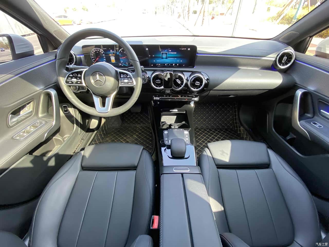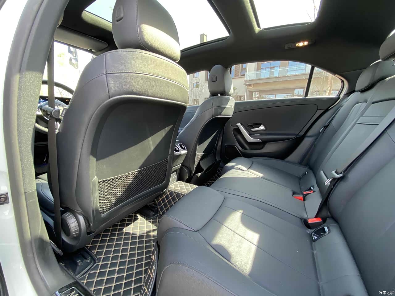 黑色内饰整体看起来还是很有质感,配以车门等处的银色装饰,还是挺有豪华感。圆形出风口算是奔驰的标致了,挺好看挺有造型的。小飞机方向盘造型我也很喜欢,配上双联屏,让开车心情愉悦。座椅包裹性还不错,腿托还是很舒服,就是只能手动调节,稍微麻烦点。可以无钥匙启动,但没有无钥匙进入,还是没那么方便。 分段式电动天窗还不错,车里光线更加充足通透,但没有车载空气净化器和PM2.5过滤,还是稍微觉得遗憾,总还是想车里空气更清新一些。