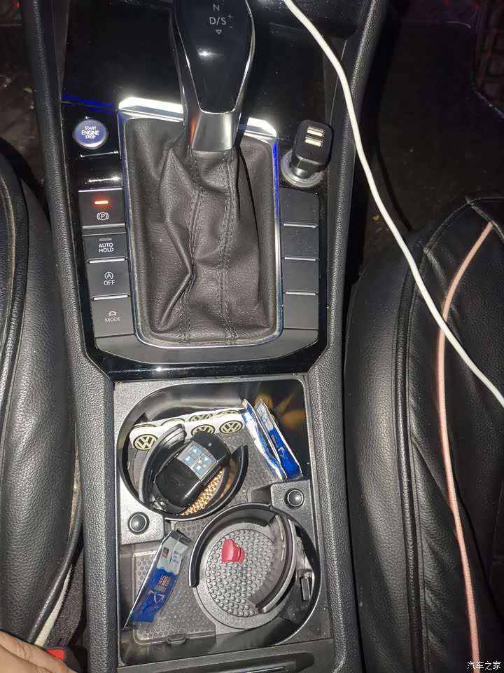 车内有两个水杯架,不用的时候有两个按钮按一下两个水杯架自动收缩,这样就可以放很多东西了,两侧门板放的东西也很多,可以夜雨伞、抹布之类的东西。
