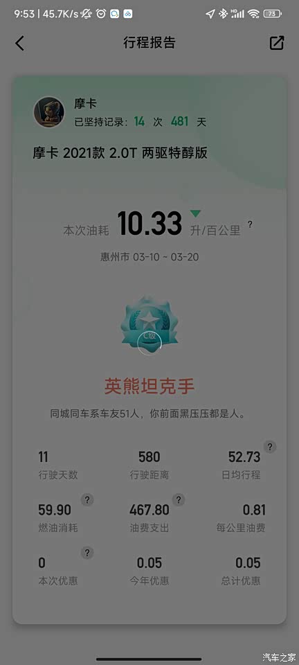 平时通勤市区跑10个油左右,跑高速就很省油了,应为48伏电机的加持,7个油左右