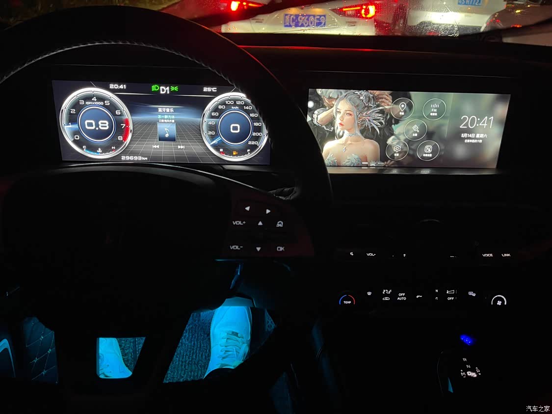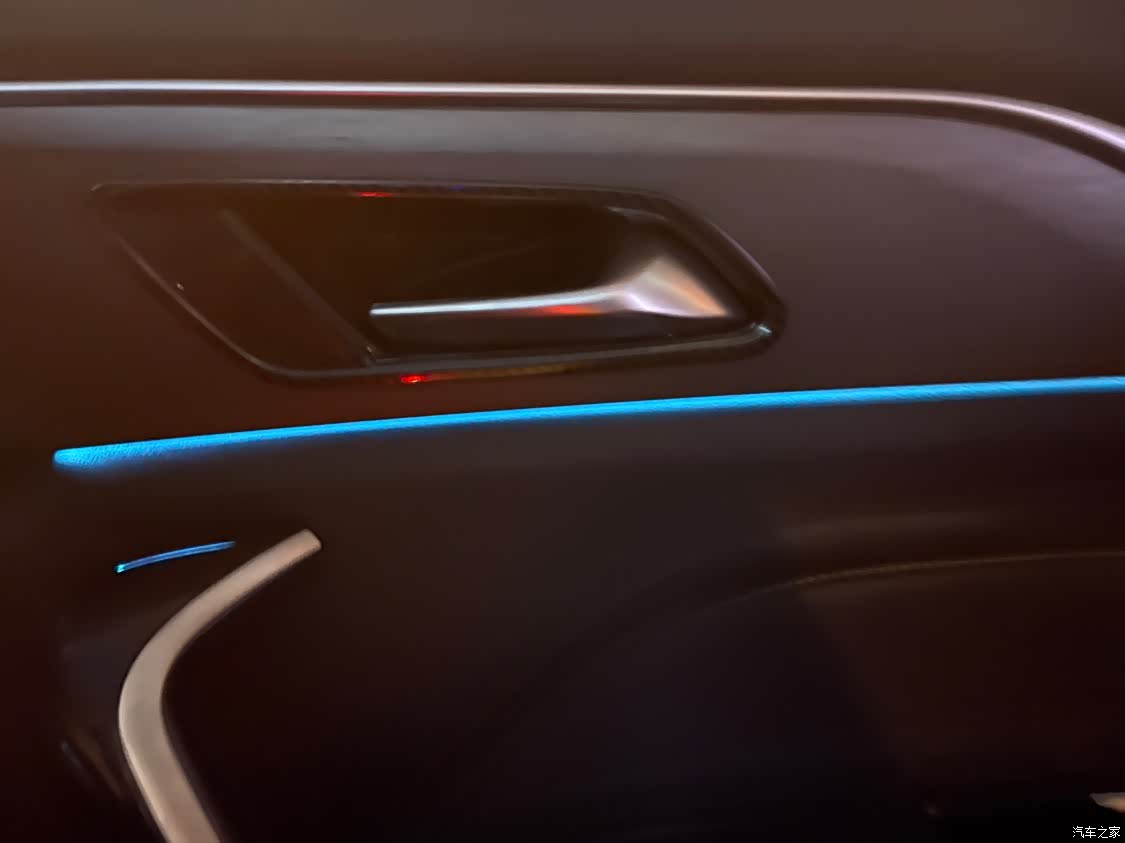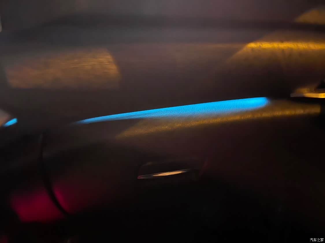 氛围灯只有单色,有点小遗憾,四个门边都有氛围灯,还副驾驶储物箱上面也有,白天效果不太明显,欠缺点亮度。