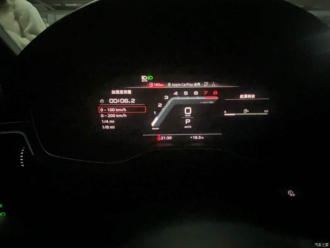 动态模式s档还算有力,全程98油伺候,不弹射也没有任何脚法,单纯地板油车上两人用奥迪自带加速度测量百公里为6.2s