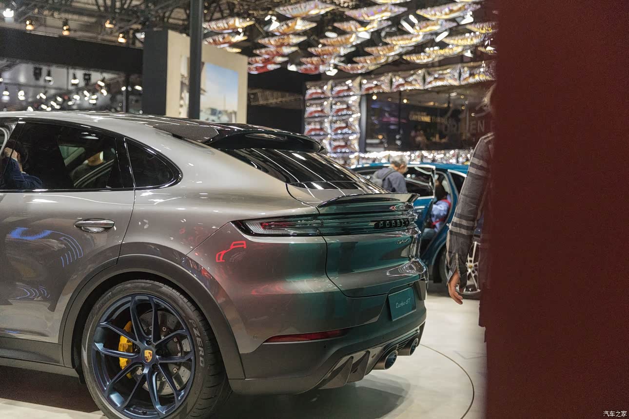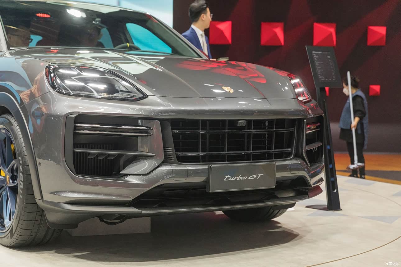 造型方面,新款卡宴普通版依旧是传统造型SUV,不过我们最强性能版Turbo GT则采用Coupé车身形态,说简单点,就是细节造型上更具运动化,看上去也更具战斗气息。 不过无论是哪种车身形态,全新卡宴的设计风格还是一致的。我们拿新款相较于老款,谈谈具体的变化有哪些吧。 作为中期改款车,新款保时捷卡宴还是基于第三代车型打造,主要针对发动机盖灯组,前格栅以及包围进行了微调,但是肉眼可见有明显的变化在里面。新车换上较旧款更大尺寸的中网与两侧通风口造型,并采用贯穿式设计,且对前灯组的轮廓进行了微调,使其造型更具棱角,前脸感觉就是重新设计过的。相较老款车型,新款看起来会更加的精致以及运动。而新款保时捷卡宴的灯组采用最新的 HD-Matrix LED矩阵式头灯组,灯腔内部由单透镜升级为四透镜,效果也更好一些。 整体的车身轮廓,与现款车型是保持了高度的一致。也就时说新款Cayenne并无明显变化,继续提供20英寸、21英寸以及22英寸三种不同尺寸的轮辋供选择,尾部以较圆润的造型呈现。至于我们这台Coupé造型的Turbo GT,则提供更流畅的溜背造型,并配备双扰流板,更加运动化一些。 尾部方面更细长的LED灯带,使其更具简洁感,同时牌照的位置也移到了下方,所以现在整体看起来确实要比现款车型更加的富有层次感。Turbo GT则是在车窗边框等部位进行熏黑处理。对了,新款尾排布局提供双边双出、双边四出,是不是更具个性化,也让运动感有所不同?