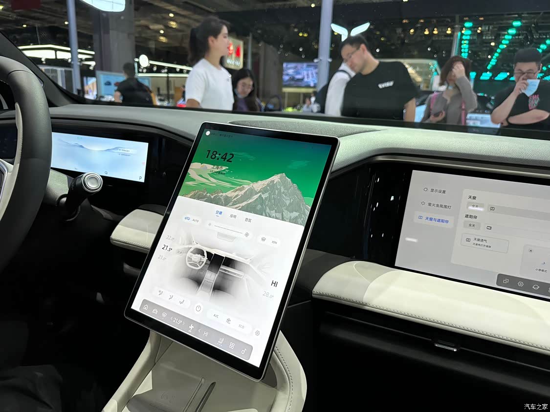 中控台有三块大屏,10.25英寸驾驶信息数字液晶仪表、13.2英寸中控屏幕和16.2英寸副驾驶娱乐屏,且都是使用的骁龙8155芯片,整体流畅度比同类车型车机流畅,但有些手动操作需要两次才能成功。中控屏幕下方有两个手机槽,左侧是50W的无线充电板,可给手机进行无线充电,另外在充电板上方留有USB和type-c两种充电接口,隐藏在屏幕后方,实用而不失美观。还配有实景的25.6英寸的AR-HUD的导航,音箱配备的是燕飞利仕的音箱,充电支持快充、慢充和对外放电3.3KW。