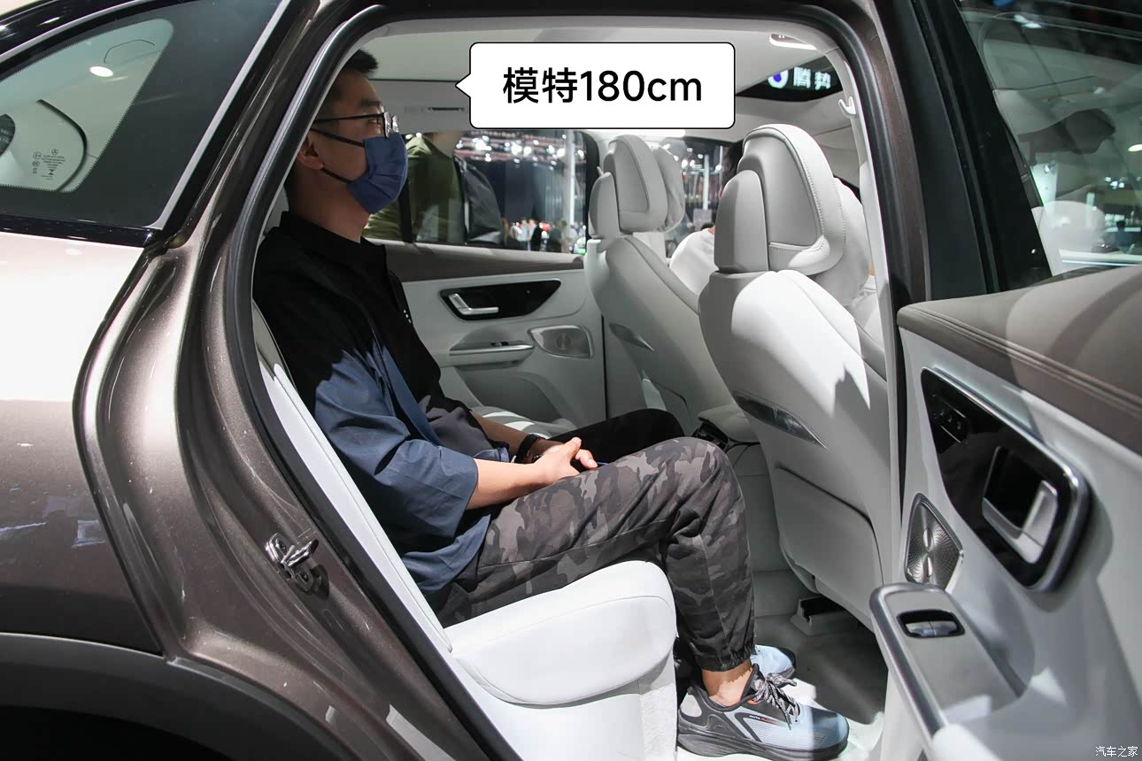 前排的空间设计的很有特点,轮拱的位置很靠前,所以副驾驶脚部深度很大,有一个宽阔的斜平面放脚,是非常舒服的。不过大面积的仪表盘,还是对前排的空间存在一定影响,占据了很大位置。 后排空间说实话没有我想象的大,甚至都没有此次车展宝马iX1和X1的后排宽敞,身高180cm后背紧贴椅背坐直,膝盖前方有不到两拳空间,头顶也差不多两拳,不会有压抑感。 后排坐垫长度不完美,只能承托模特大腿的三分之二,这一点仍需改进。不过后排中部的地板没有凸起的高台,即便后排坐仨人也不会姿态尴尬,这部分给予好评。