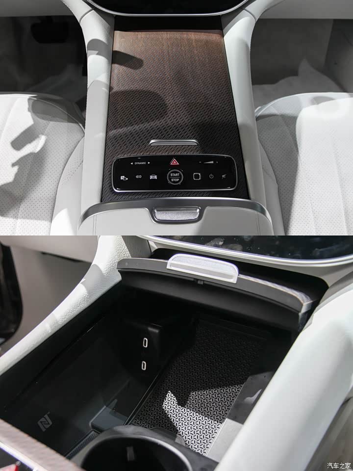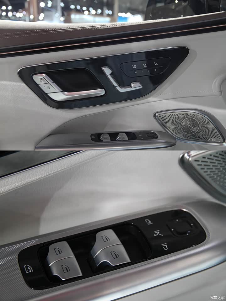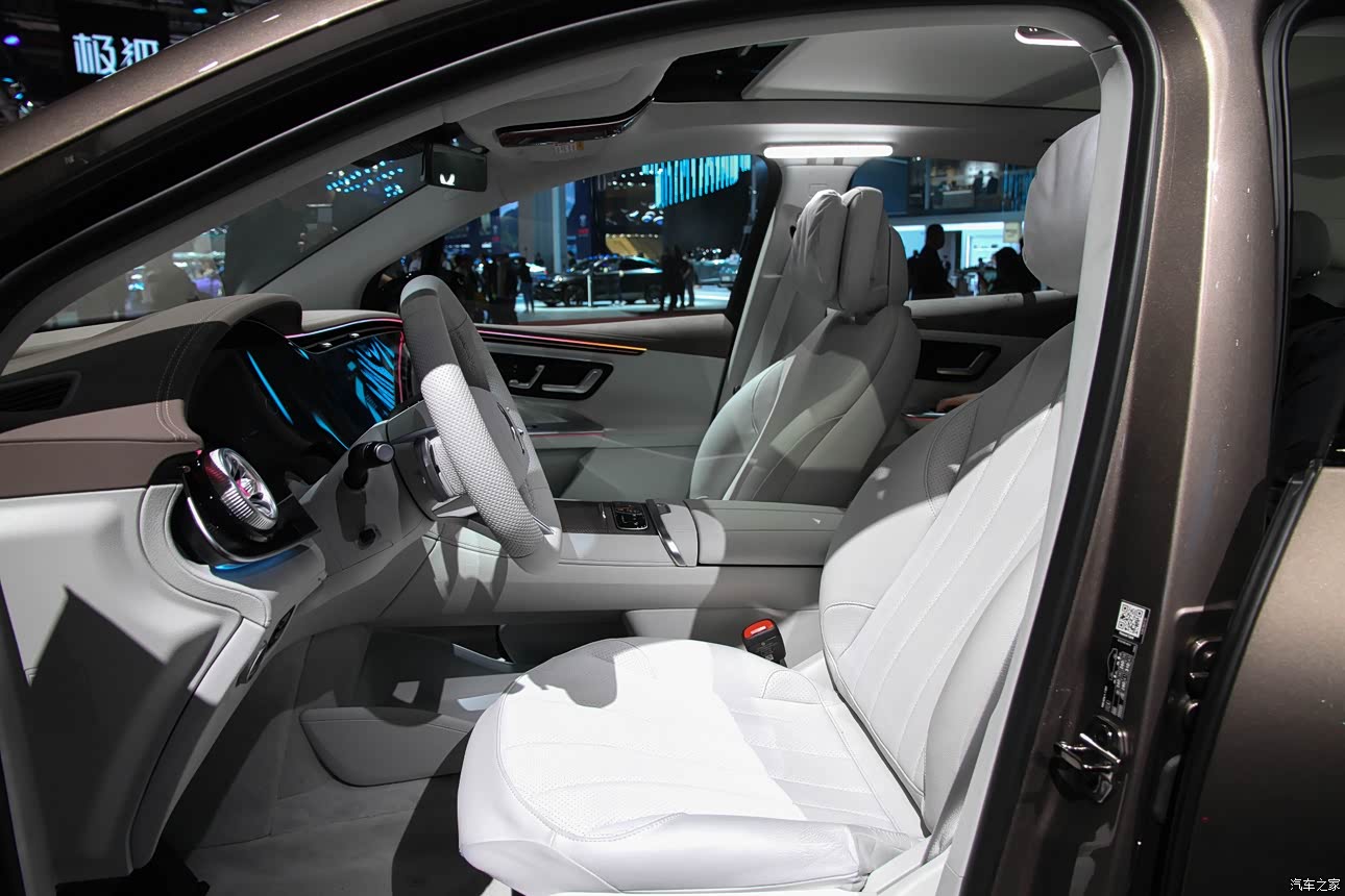 中控整体轮廓和布局基本上一如既往,只不过屏幕尺寸越来越大,车展现场是EQE 500的车型,标配有MBUX超联屏,这是可以选装的,低配EQE 350还是分体的仪表屏和中控屏。科技感拉满,奥迪e-tron与EQE SUV相比表现差很多,内饰还是奥迪的老一套模板,丝毫没有科技感和高级感可言。 参展现场的内饰大面积都是乳白色的,显得车内又亮又干净,但是在实际开车的应用中这个颜色是非常不耐脏的,就算以后铺上地垫,也总不能“上车请脱鞋”吧? 座椅是真的很舒服,主副驾两侧有高起的支撑部分,翻毛皮的航空头枕可以任意调节,包裹性、舒适性、美观程度完全体现出奔驰的水平了;反观对手奥迪e-tron,座椅看起来简约却也简陋,没有超出这个价格定位的表现。