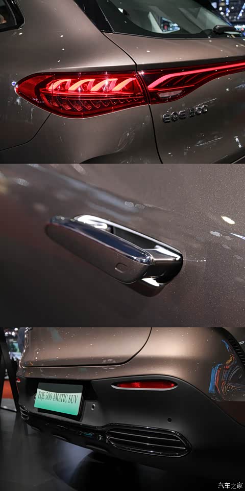 从外观乍看一眼:这不就是换了中网的小号的EQS SUV吗?其实也很好区分,除了中网的区别外,EQE SUV日行灯里有三个点状,EQS SUV则是两个。EQE SUV的轴距和海外版一样,车身整体会大一点,看起来体型壮硕,符合中国消费者的口味。 全封闭式星辉格栅明确传达了信息:我,是奔驰,纯电车。而且Logo到晚上还能发光,这一点好像特别爱招显的油腻男,相比之下奥迪e-tron可真是太低调了。 EQE SUV的轮胎是20寸的,这么大体型的车配这个看着就有小,就像一米八大个儿长了一双36的脚,轮拱边缘缝隙很宽,因为没有空气悬挂,所以不确定这样设计是不是想要让它有一定越野能力。 其他方面来说,这辆车外形没有什么太大的可圈可点之处,就是奔驰EQ系列家族式的设计,表现平平,不好不坏。