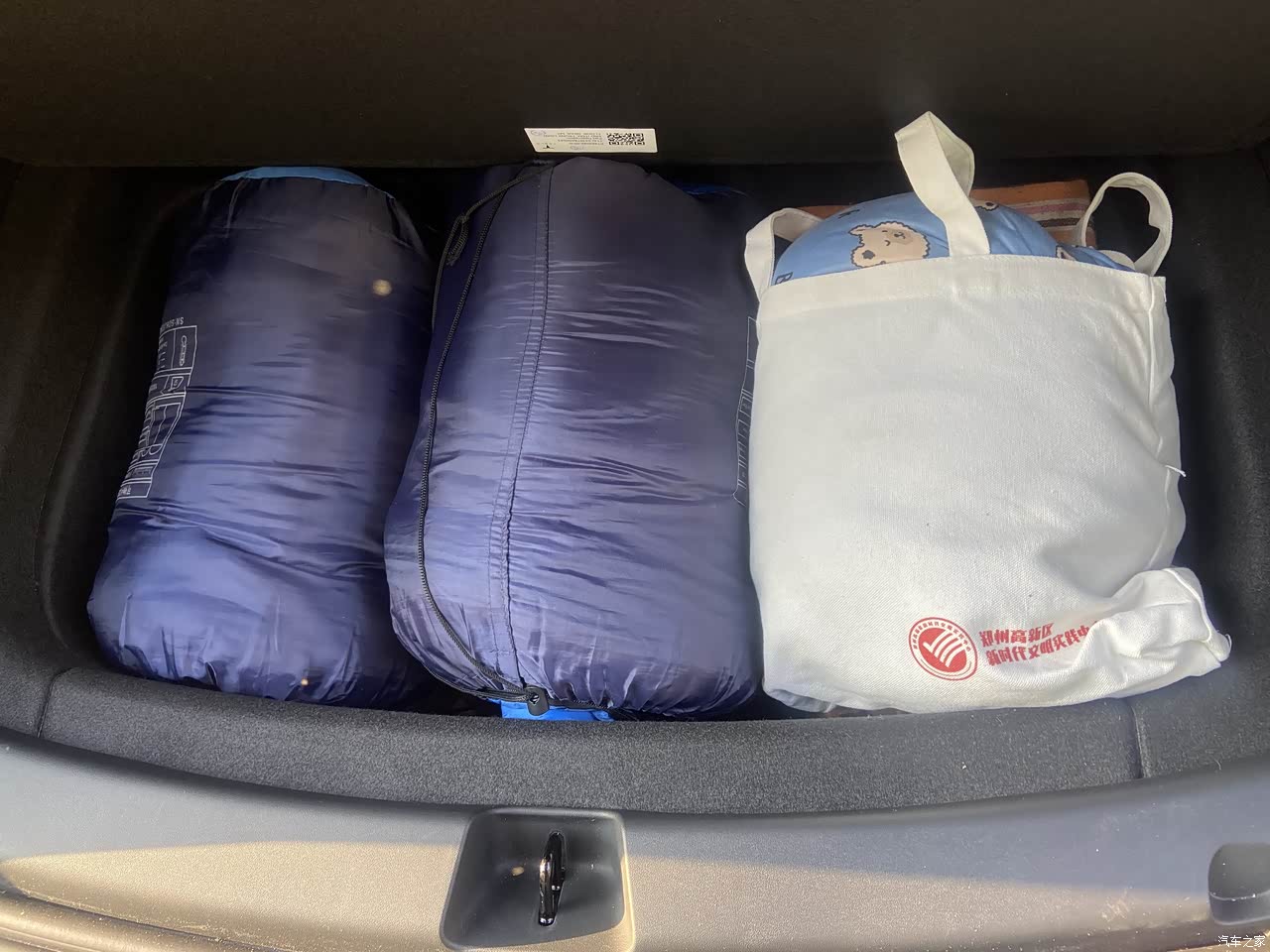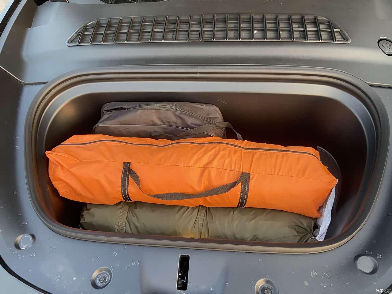 前后备箱真的很大,前备箱可以放下一个六角帐篷、天幕、幕布、随车充、羽毛球拍等。后备箱下箱可以放下两个睡袋、一个充气床垫、一个工具袋。上面还可以露营。