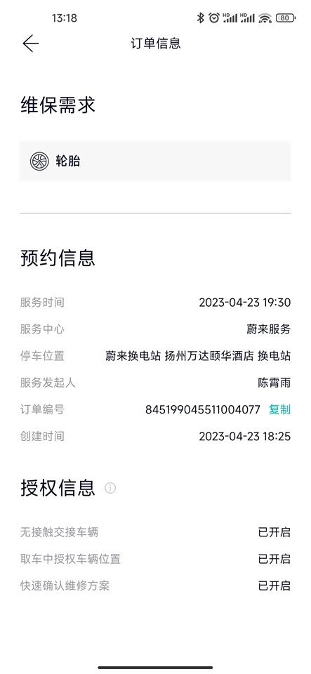 买车两年多,从来没有在除了微信和蔚来社区以外的地方发过用车感受,但是最近网上不知道是怎么回事,蔚来的黑子越来越多,甚至都有了“作蔚来车主,品怨种人生”段子,对于这种攻击作为蔚来车主真是来火。作为一个有素质的人,我只能用事实和道理反驳他们,不能说狗咬我一口,我就咬狗一口,这样就着了这种黑子的道了,反过来他们会说蔚来车主的素质也不过尔尔。今天我来分享一下蔚来的售后,也打打这些黑子的脸。 今年五一节前两天,从南京回盐城参加同学婚宴,上高速没多久,自己闲着无聊看看胎压,就是这个随手一看发现右后胎胎压异常,只有2.2,其余三个都是2.8。我一下子脊背发凉,生怕爆胎,车子都不敢开快了,心理问题也出现了,都感觉车身好像有点歪[擦汗]。 我是从南京出发去盐城,中途设置了扬州万达换电站,看了一下导航,大概晚上7:20就可以到换电站了。在这期间,我就让我老婆通过手机下单了“上门补胎”,预约了晚上7:30在扬州万达换电站补胎。下单成功后,蔚来客服就联系了我们,我们和客服说明了一下情况,车子右后胎胎压异常,估计被扎钉子了,预计晚上7:30到扬州万达换电站,希望可以安排一个维修的师傅在扬州万达换电站维修。蔚来客服在电话里问了我一句需要安排拖车吗,我都笑了,是不是好的有点过分了。维修订单下单后,我在车上想了想还是笑了,想到了“西北锤王”的台词“秀莲,我和你说,你对我好的过分了,我也是要捶你的”。 平时我开车都是顶着20%限速开的,这次开老实本分多了,但还是7:20没到就到换电站了,到了换电站车上人先下车去酒店方便了一下,顺带下车活动活动,到周边买点吃的,等待期间也顺手把车子换了个电,换完没多久小哥就到了,小哥人很客气,解释说本来可以早点到的,因为当时外面下雨,路况不好,就稍微晚了点,说着就打开后备箱,收拾工具准备开始维修了。不得不感慨,直男对蔚来后备箱那一套工具毫无抵抗力,满满机械感,期间我也咨询了小哥,这一套维修工具大概多少钱。小哥和我说这一套维修工具是进口的,哪个国家我忘了,好像是意大利的,成本快20w,想到全国这么多城市,每个城市配备几辆甚至几十辆这样的车,这资本投入不敢想。想到这不得不感谢蔚来在售后的投入,为车主用车保驾护航。在此也希望国内其他新势力品牌向蔚来学习,在售后多投入一点,做好售后保障工作。 说回正题,轮胎卸下来以后一直找不到漏气点,我自己也跟着找了好久,一直没有找到漏气点,我都等的有点着急,让小哥帮我补好气算了。外面下着雨,小哥一直很耐心,一直让我进车里等,我也没心思就一直陪着小哥找,下着雨的晚上,照明的电棒显得格外刺眼,我在灯光下没多久看的就有点吃不消了,晃眼。小哥一直在灯光下找了不知道多久,估计快半小时,但还是坚持在找,过了好久才找到一个很小的漏气点,找到小哥才舒了口气,颤颤巍巍的站起来(小哥一直蹲在那里找漏气点,腿麻了)开玩笑说,要是每天来几个这样的胎,就要申报工伤了,眼快瞎了。 后面才是理工男的最爱,小哥调着后备箱那一套工具,听着设备传来的机械声,太解压了。设备太齐全,我非专业人士也没办法形容,大家可以看看我拍的图片。可能太关注维修的那套设备了,没多久小哥就完成了补胎工作,本来可能半小时的工作,我这个胎花了一小时。完成维修,蔚来小哥还一直和我说不好意思,让我等这么久,这一出整得我都有点感动了,小哥真是特别热心,知道我要赶路,上完轮胎工具都没收拾,说先帮我把维修订单点击完成,因为维修期间,我车子状态一直是维修中,后台不帮我完成维修,我车子启动不了。真是特别感谢蔚来小哥,蹲在雨里帮我找了那么久的漏气点。 上车没多久,和同学说了一下情况,告诉半道轮胎扎钉子然后维修耽误了一个小时,同学以为我找了高速救援,花了不少钱,然后知道我这个是蔚来的配套服务,一分钱没花,来了一句“这服务是好”。