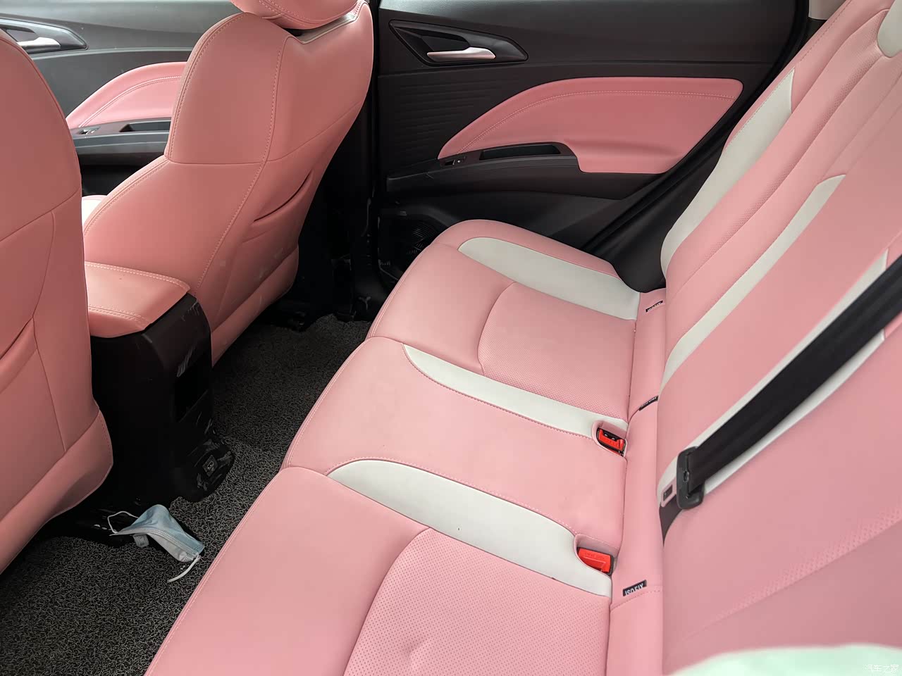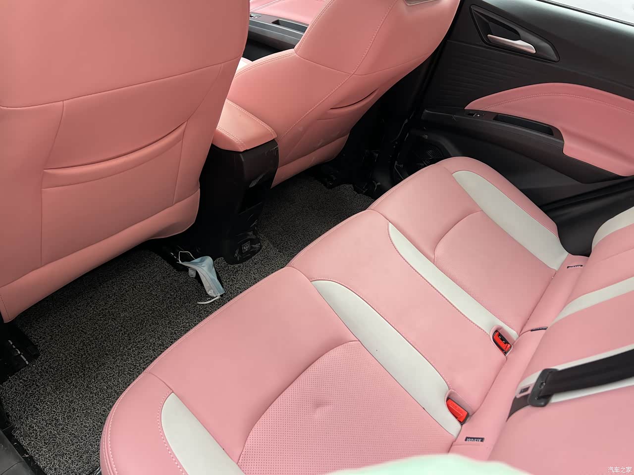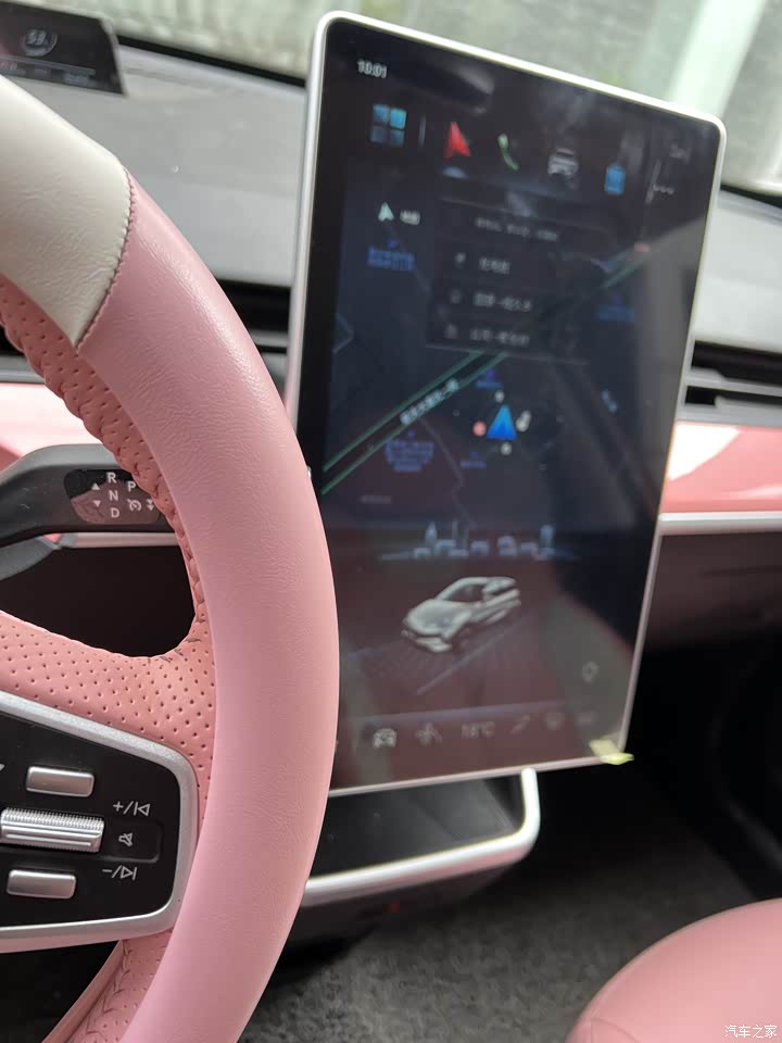 内饰也是一样采用了和外观一致的樱花粉的配色,不过加了白色搭配,让车内看起来更清爽一些。大屏特别大!
