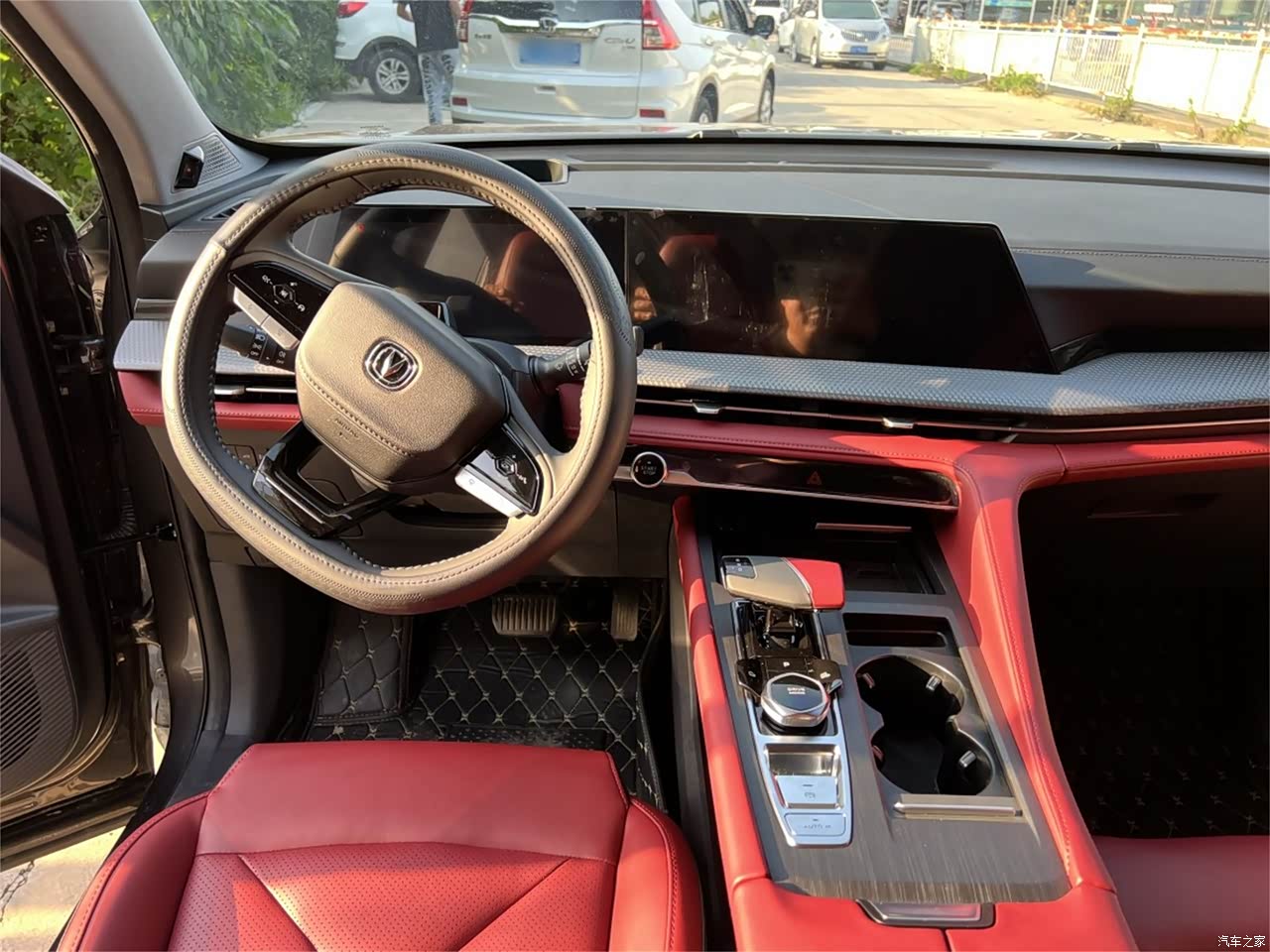 挡住长安车标,这内饰看起来绝对不像只有十多万,如果要用一句话来概括,那就是“看得见摸得着的豪华”。车内大量采用软性材质覆盖,能摸到的地方几乎都是软的,而且红黑配色更显高级。双12.3寸连体屏科技感挺高,车机智能反应速度也很快。