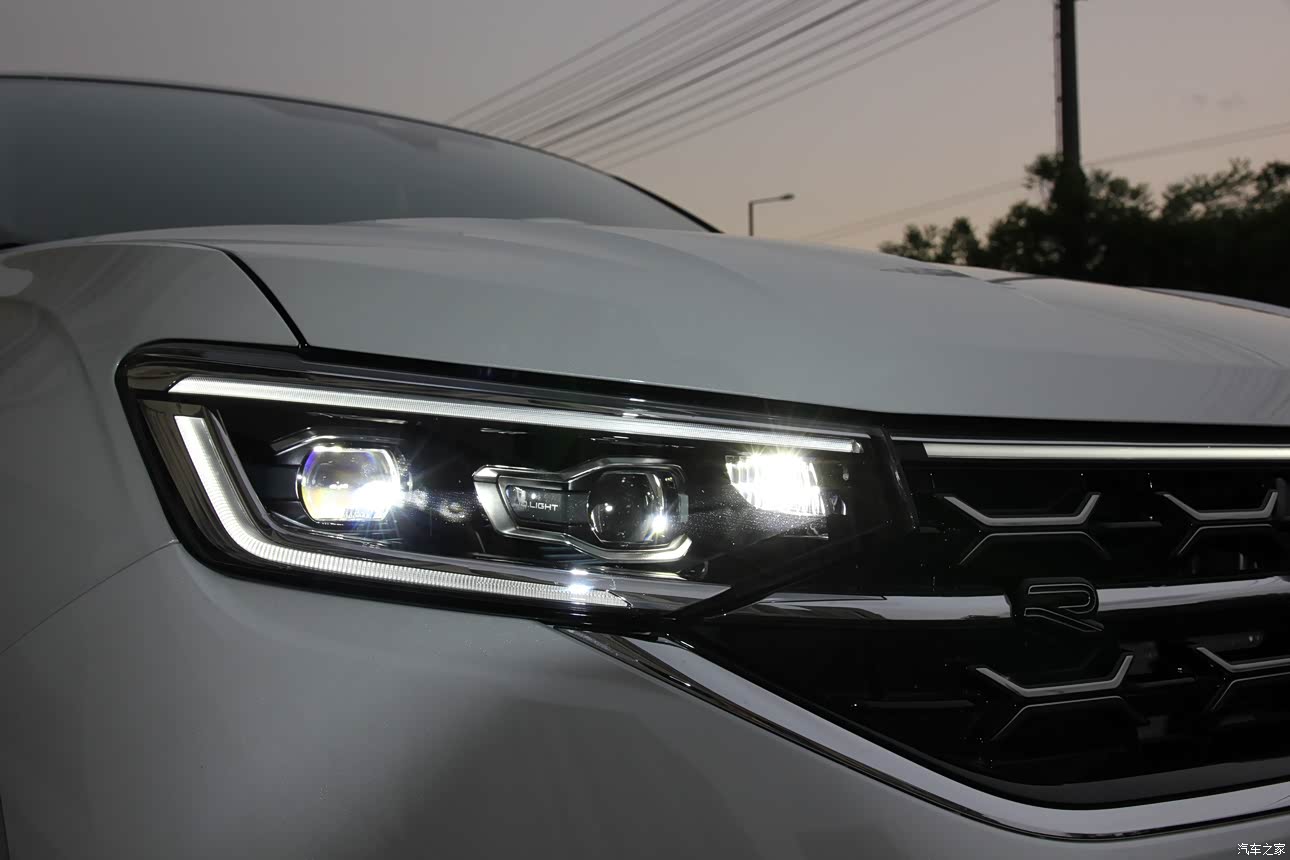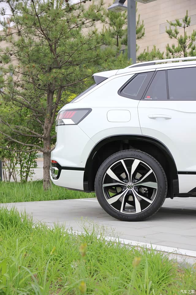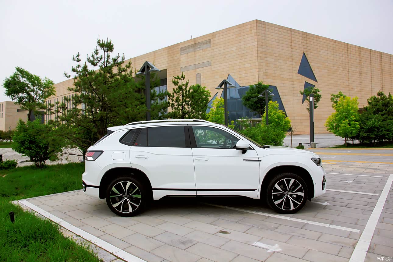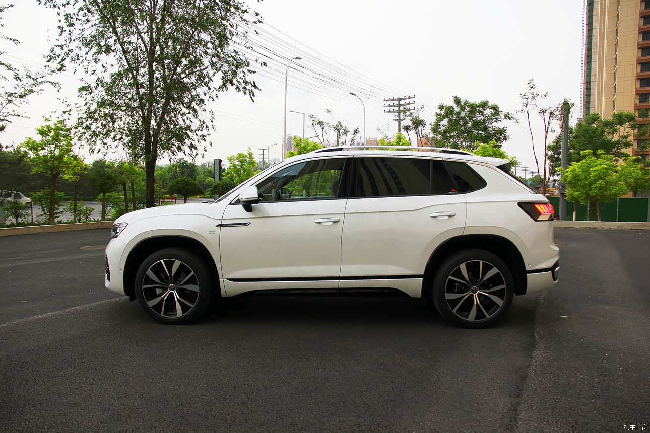 外观整体看着大气沉稳,当时计划选锡石灰,但看了实车颜色后有点犹豫,最后和老婆商量加了2000元选了珠光白,这个颜色在阳光下特别漂亮。车身侧面看着非常敦实,有点途昂X的影子,前机盖高显得虎气。