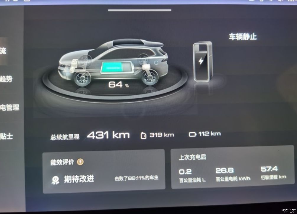 一般市区代步都是纯电,基本在170公里左右,跑了一次小短途,单程140公里左右,去的时候充满电,全程空调,一路上坡,到了还剩7公里左右的纯电续航,回程的时候,一路下坡,几乎没开空调,里程大概133公里左右。到家居然还有40%的电,纯电续航还有70公里,高速上NOH确实比较实用,只要手扶着方向盘就好了。