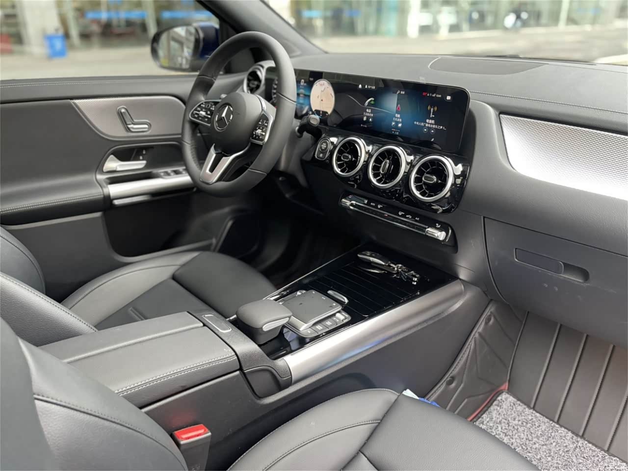 内饰看上去是标准的奔驰风格,尽管说是低一阶的车内饰并没有在豪华性上有什么不足,相反一眼看去还是极具特点。比如说像飞机引擎的空调出风口,尺寸比较大以及功能很丰富的中控屏,美中不足的是中控部分的材质确实普通。