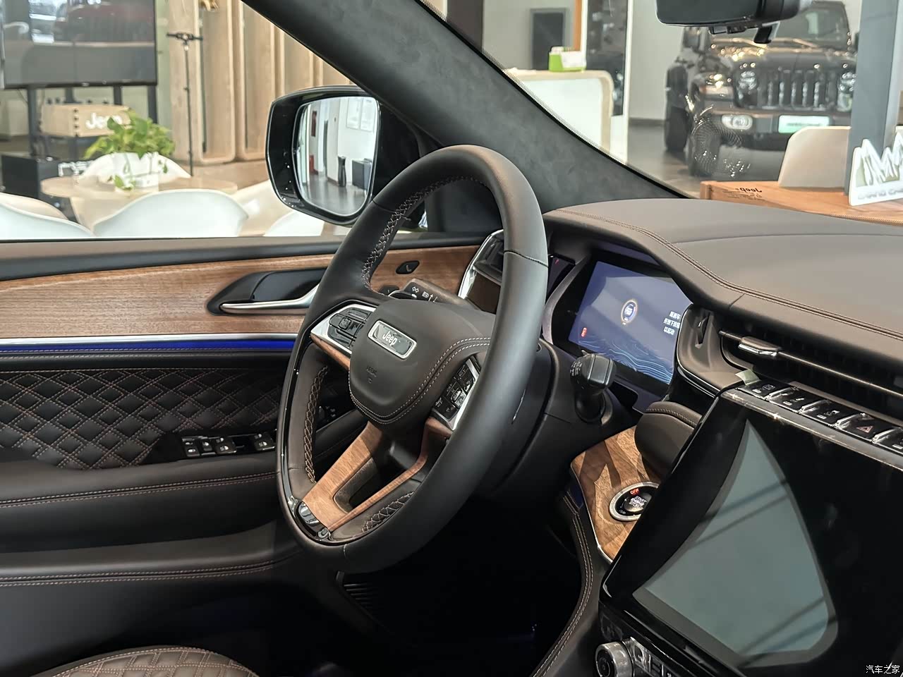 内饰方面,Jeep大切诺基4xe看起来颇有美系豪华SUV的感觉,而且这次也是融入了很多科技元素,比如10英寸全液晶仪表、10.1英寸中控屏、10.25英寸副驾娱乐屏,属实让人看到了不一样的Jeep。至于旋钮挡把及HUD抬头显示,以及可选装的19扬声器麦景图音响系统等等,都让Jeep大切诺基4xe变得更有诱惑力。