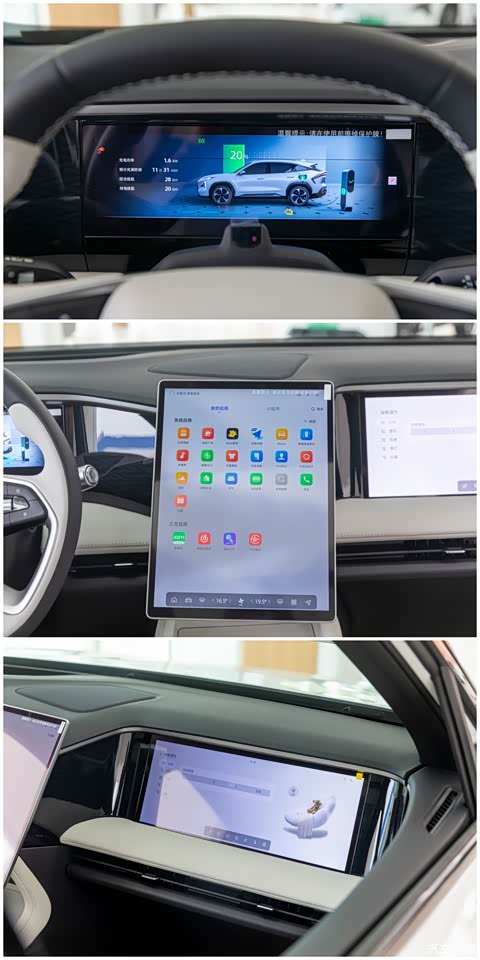 吉利银河L7标配10.25英寸仪表+13.2英寸中控屏+16.2英寸副驾屏三块大屏还是蛮不错的,屏幕之间可实现智能交互。车机的语音唤醒速度也很快,支持全场景可见即可说、同时支持四音区识别、连续对话,足够智能。