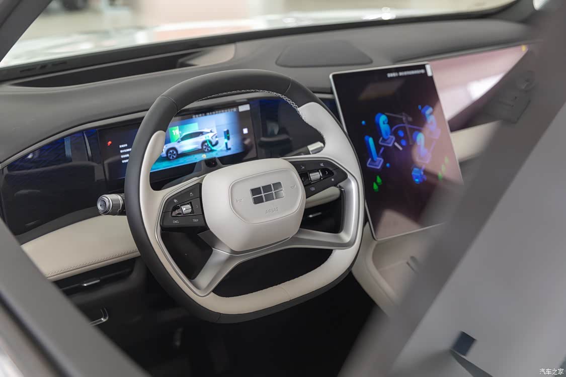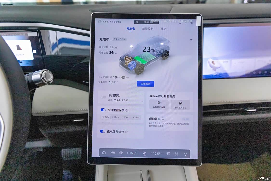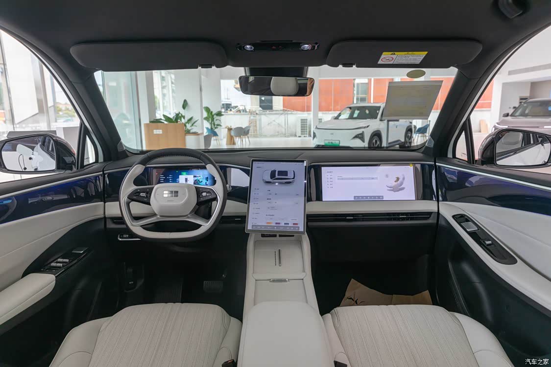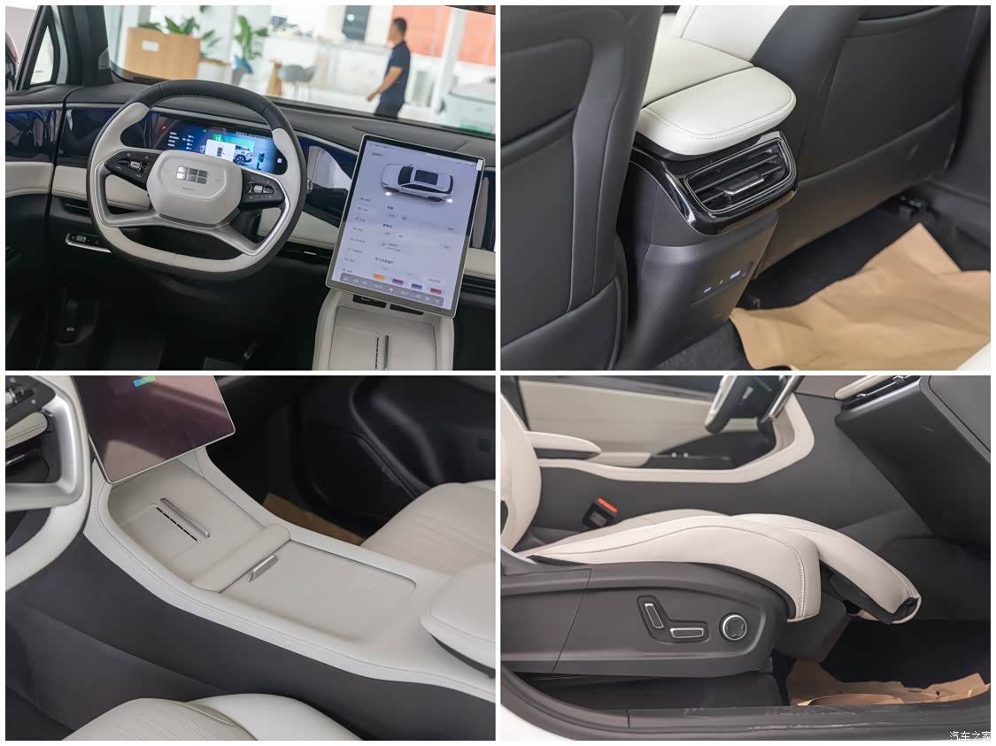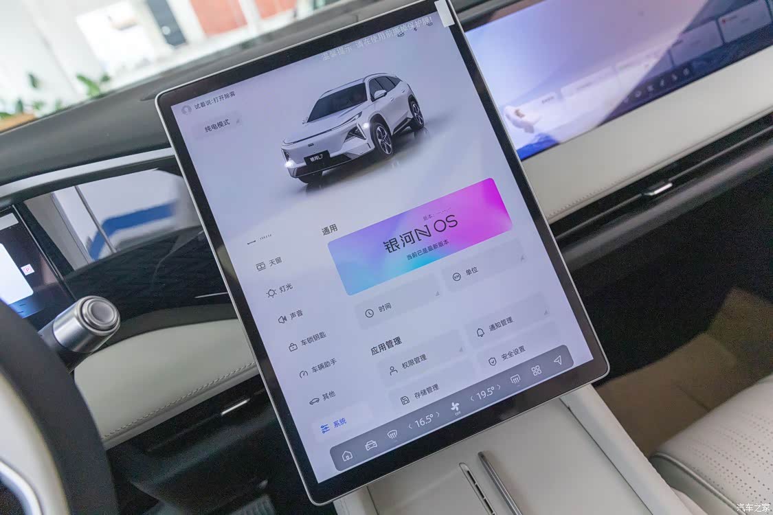进入车内,银河L7的内饰设计则充满了妥妥的高级感,黑白内饰的搭配宜家宜商。环抱式的座舱对主驾驶非常友好,整个仪表台是更加偏向于驾驶员一侧的,就连13.2英寸的悬浮式中控屏幕也是具有角度倾斜的,都是为了让驾驶员可以更好地观察和操控车辆,不过这块大屏幕并不支持角度的调整。四辐式设计的方向盘,上下均为平底造型,偏运动风格也很有质感,握着更是舒服。10.25英寸的液晶仪表盘是完全与中控台融合到一起的,要是周边的黑框再窄一些,看起来整体感就更强了。25.6英寸的AR-HUD抬头显示系统,可以帮助驾驶员提升车辆的驾驶安全性。 13.2英寸悬浮式中控屏幕内置高通骁龙8155车规级芯片,搭载银河NOS车机操作系统,操作流畅度和处理速度都让人满意。值得称赞的是,全系都在副驾驶位置还标配了16.2英寸的副驾娱乐屏,可以满足副驾驶的一些娱乐需求,车内除了有50W的无线充电板,也有USB、Type-C接口,电子产品充电都没问题。 至于一体式设计的座椅造型还是蛮新颖的,靠背弧度比较符合人体工学,加上柔软度适中的乘坐感受,还是蛮不错的。