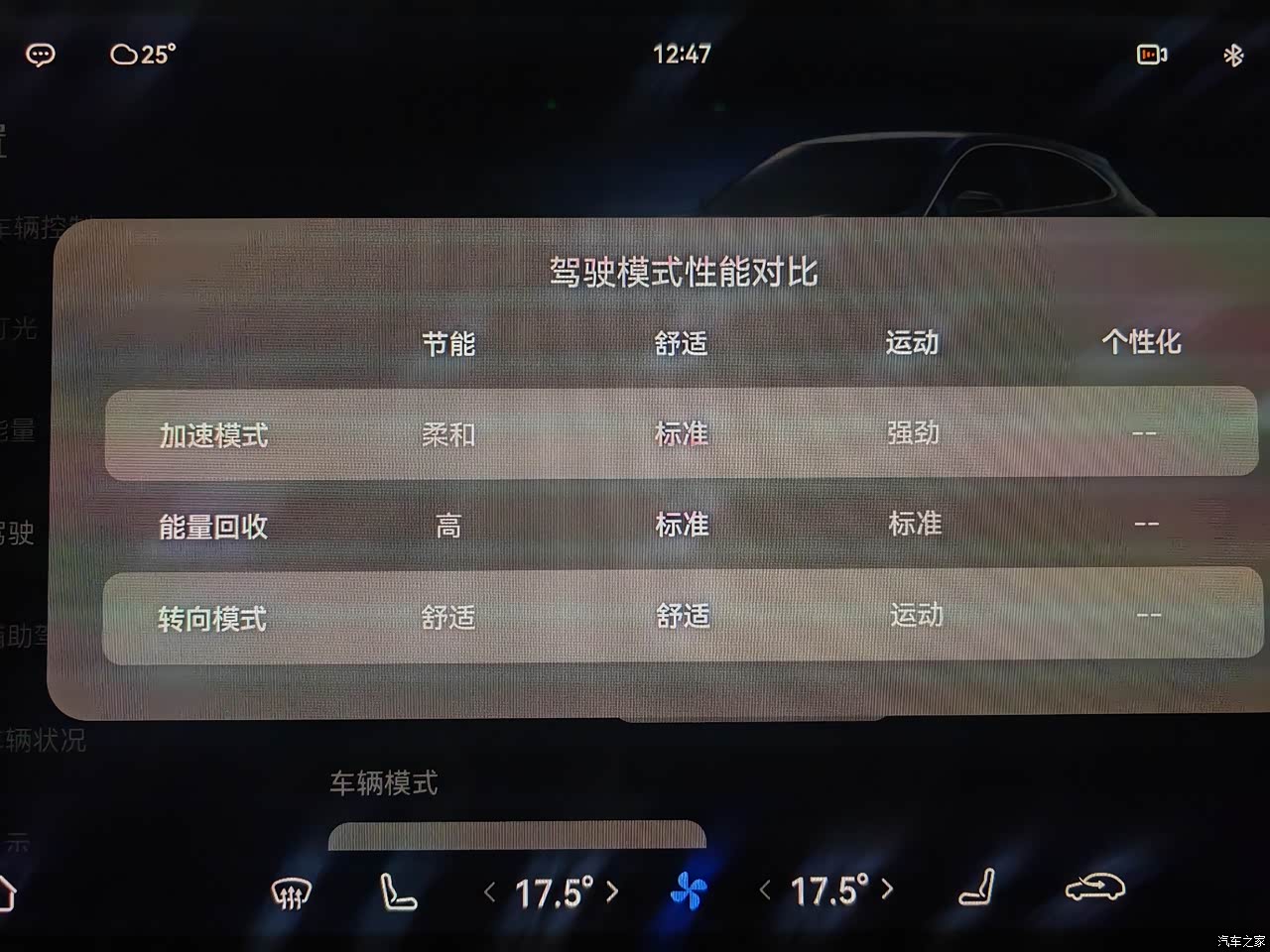 日常使用舒适模式足够,油门轻重适中,动能回收也比较缓和。 节能模式感觉油门加重,松油门制动很明显。 运动模式相当狂暴,轻踩油门就窜出去了。