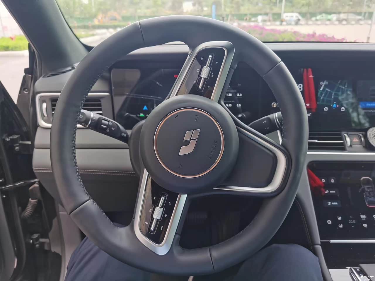 首先要说说它的4块大屏幕,显示清晰无可挑剔,加上氛围灯设计感拉满,真皮方向盘,真皮座椅,后排纯平地台。飞机档把个人还是喜欢的,内置行车记录仪等