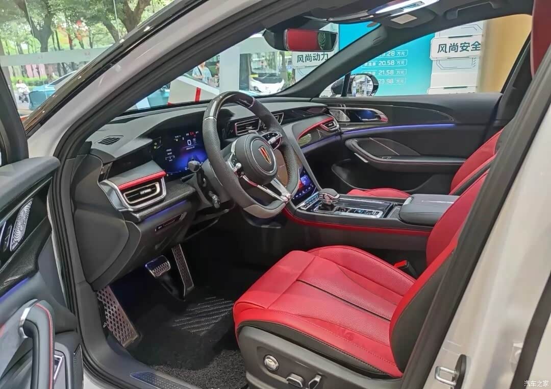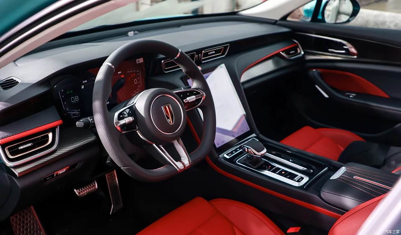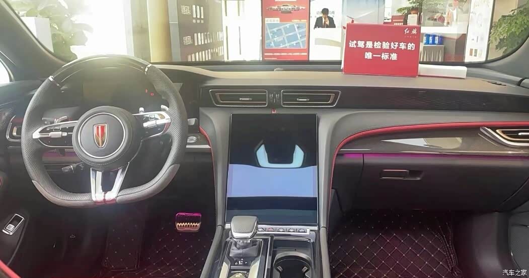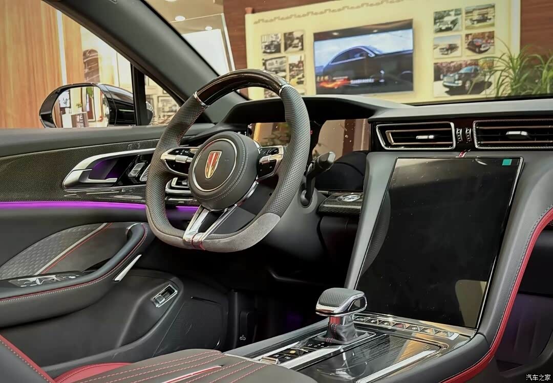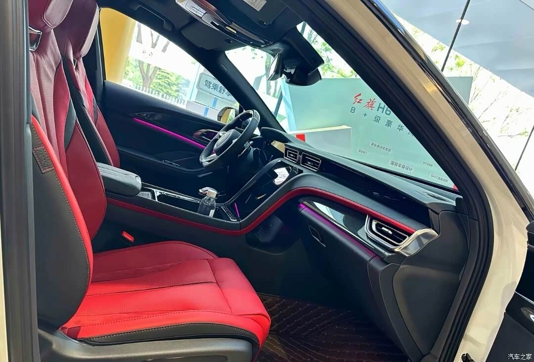 内饰呢,要我说内饰也是足够用心的,运动化方向盘,换挡波片,这里的碳纤维那里的碳纤维,运动座椅,亮色线条,你能想象这些出现在红旗的车里吗?而且啊,这些啊,都是基于家族化设计新增的元素,所以啊,豪华感同样在线。中控的这一块12.6英寸的液晶中控大屏,之前我们在H5身上也感受过了,操作便捷,视野宽过,功能也算丰富,唯一不足的就是流畅度以及语音的响应性,跟新势力相比啊,还是有些差距,虽然瑕不掩瑜,如果能稍作升级啊,会更受年轻消费者的青睐。之所以说是瑕不掩瑜啊,一是因为它的实体按键都没有缺席,二是因为H6舒适性配置是真不错,座椅按摩、通风加热都安排,氛围灯空调箱氛系统也都有,还有这套音响是单拿的,后排的头顶都给按了两个喇叭。