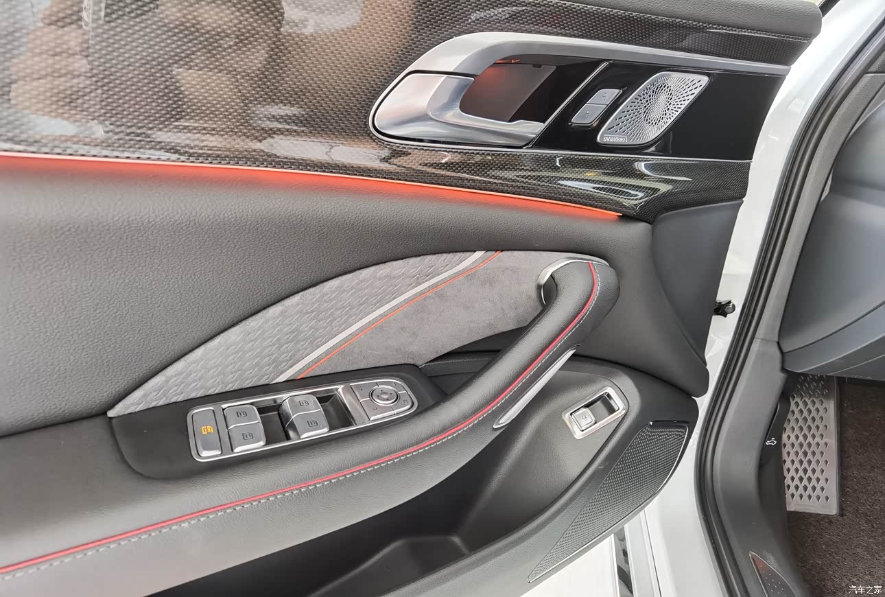 坐进车内首先就感受到一体式真皮座椅的舒适性,包裹性很强,长时间驾驶也不会觉得累,并且中控超大的屏幕让内饰更显豪华,操作系统也很流畅,屏幕更大,导航查看地图更加方便。车内还采用了碳纤维,坐进车内,感觉非常的年轻时尚,并且还采用了换挡拨片,让驾驶体验更好,出风口的造型设计很新颖,镀铬装饰条围城一圈,让出风口更有立体感,在中控屏幕下方还有空调控制按键,采用了实体按键,并且还有略微凸起,让驾驶中操控空调也可以得心应手。后排中间扶手位置的水杯架我觉得设计的很小巧,轻轻一按就直接旋转打开,非常有仪式感。