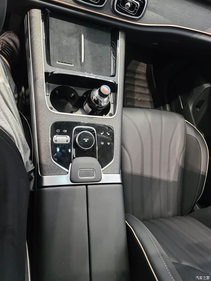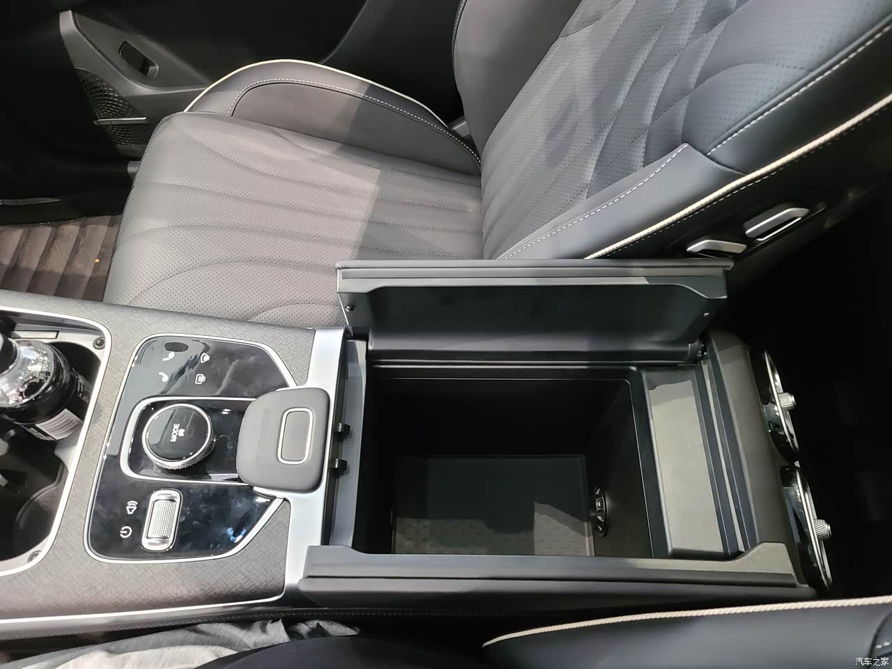 中控部分分区鲜明,各个功能区划分合理。出风口下面是无线充电手机放置,能放置两台手机好评!下面是储物盒以及控制区,向后是储物箱。空间利用率很高!