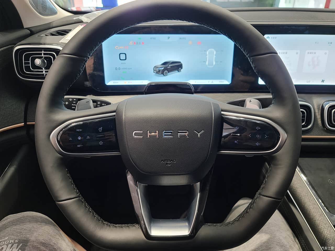 内饰的接缝均匀。上层采用类似皮革质感,不确定是不是搪塑。下层采用硬质饰板,也有花纹,搭配较协调。