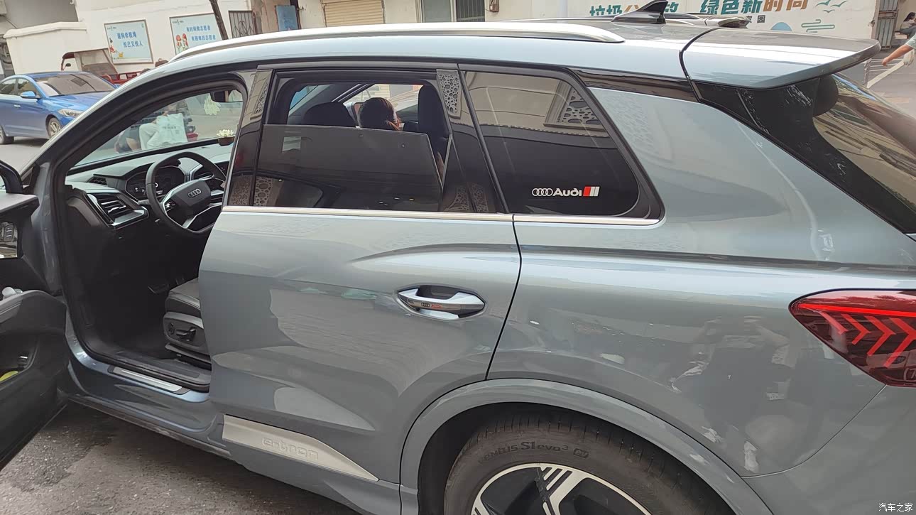 1.外观那更不用说了,我一开始想买个玉树临风的修长车型,结果到了奥迪店里就被Q4的圆润敦实所吸引。车头比较帅气,镀烙的设计也很特别,异星蓝很好看。侧身的话,具有一种力量感和流线型,尾巴带有一些溜背的设计元素。后来自己在淘宝上花了6000搞了个隐形车衣,提升了亮泽保护车漆。没有用4s店赠送的镀晶。 2.唯一遗憾的是那个贯穿式尾灯是个假把式,需要花1000多改造一下,所以也就没有去弄了。