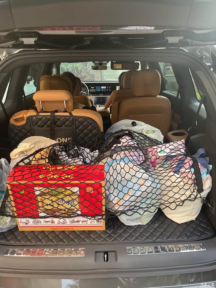 成员舒服了,后备厢就惨了,在第三排立起的时候,空间可谓捉襟见肘,主要是地台很高,有些东西能放下,结果关门顶着玻璃。简单说,儿童座椅+折叠童车是肯定放不了,必须放平第三排。放平第三排的问题是,刹车时东西会从后备箱顺着第二排两个座椅中间滑到前面来,这个还没想到好办法解决。