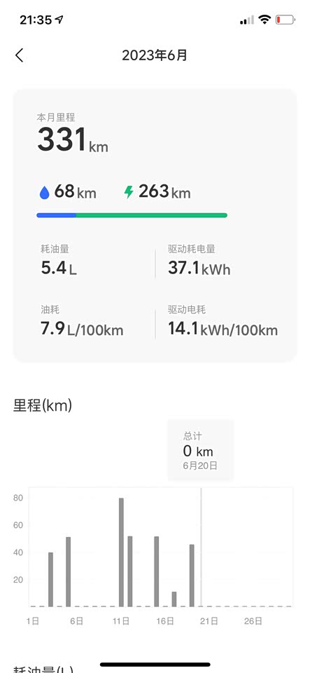 6月,北京堵车通勤的能耗。纯电优先,当电车开,没机会充电才开始用油。