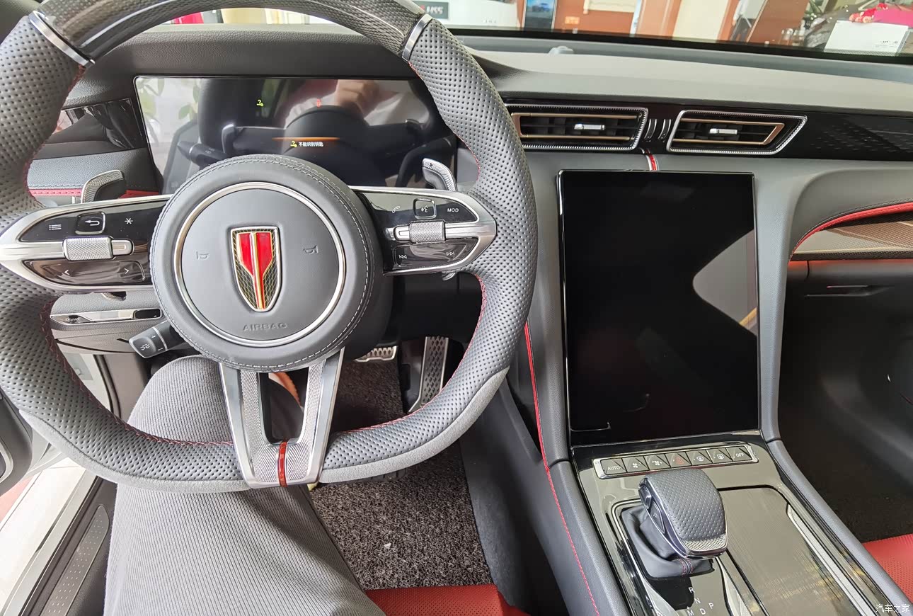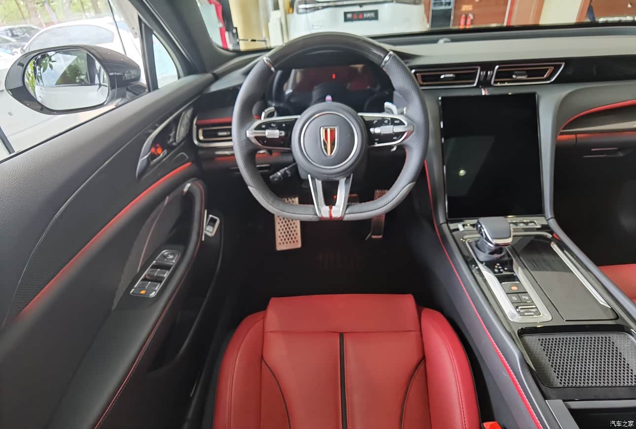 第一眼看中的就是这辆车的前脸,进气格栅搭配犀利的大灯,显得非常有气场,而且在进气格栅中间还有像雨滴一样的镀铬装饰,能看出设计的很有自己的风格与特色,中网与机盖上的红旗标志让这款车看上去更加修长,非常震撼;侧面看悬浮车顶非常年轻时尚,并且侧面线条看似简单,但是却让汽车运动的气质提升不少,再加上主副驾驶车门外侧的竖旗标,即使从侧面看,也让车辆很有辨识度;尾部采用了贯通式的尾灯,并且在车尾底部中间的位置还配备了双出排气孔,让运动气质发挥到极致。