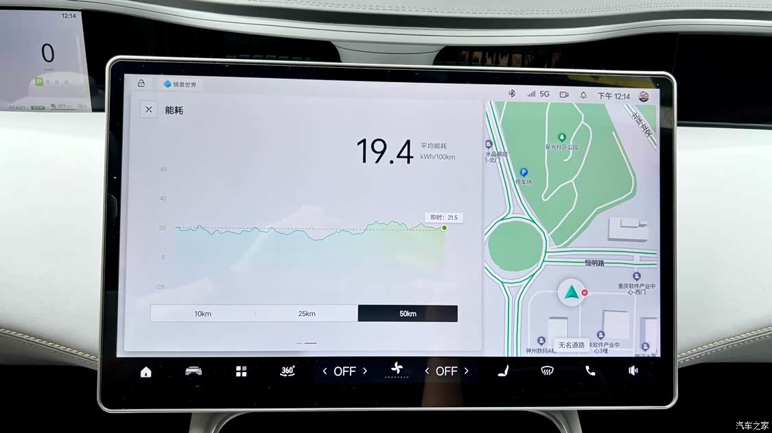 续航方面在春夏感觉有7.5折的达成率,平时的电耗大致是18-22左右吧,主要看激烈驾驶的程度,如果喜欢加速刺激、猛踩油门的感觉,可能电耗要高一些。日常满电状态下大概能跑个480公里左右吧,日常完全够用了。