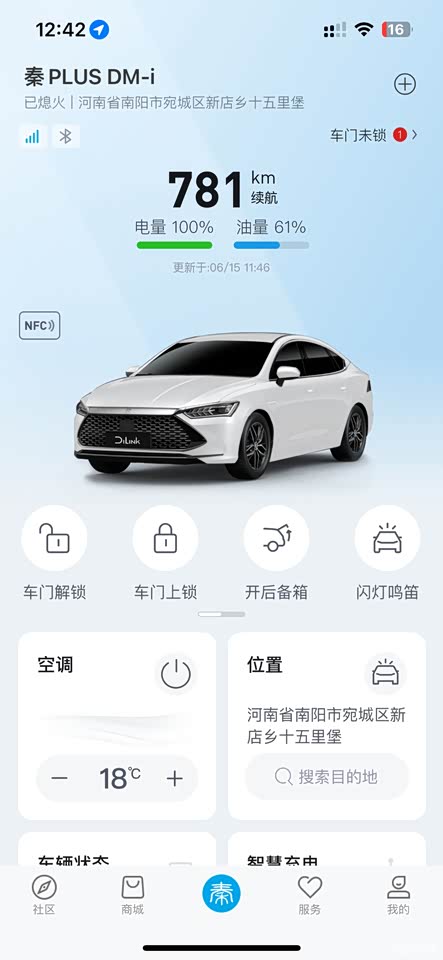手机可以远程操控解锁比较智能的是,如果你忘记锁车门的话,比亚迪APP会直接提醒您。如果你还是没看到,他会一直提醒你。