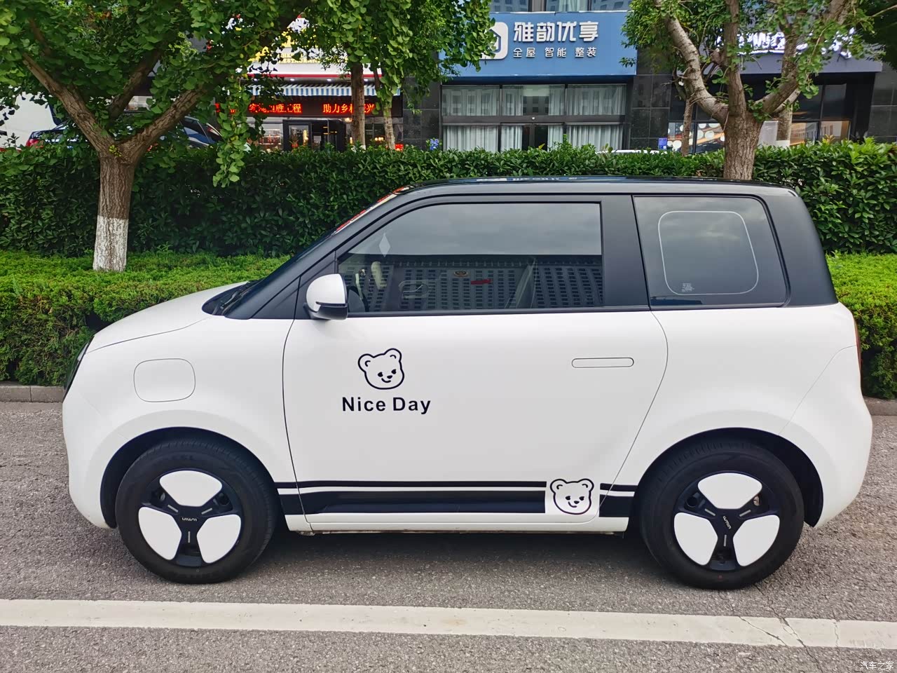 糯玉米是双开门,门比较大,隐形的门把手,没有花钱升级,觉得不影响开门,车身线条比较柔和,胖嘟嘟的,车灯像没睡醒的眼睛👀,蠢萌蠢萌的,车轮像个猫爪子,我给爱车贴了黑色悬浮顶,侧面也装饰了一下,是不是更可爱了😍