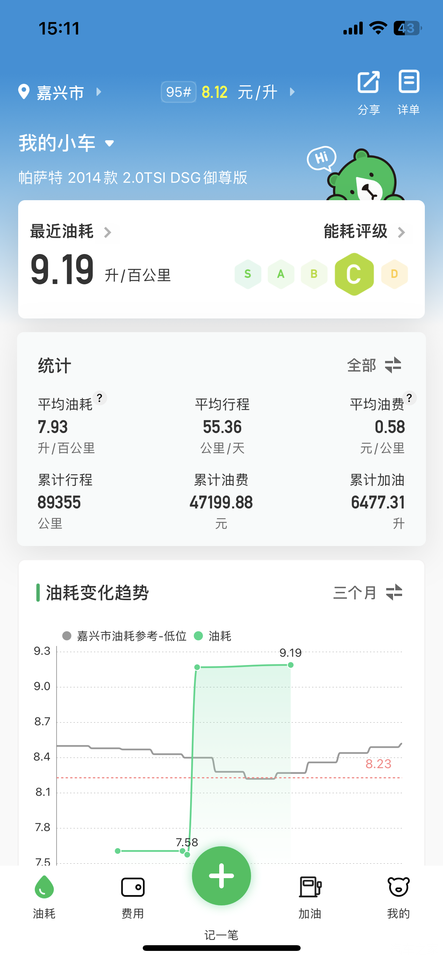 记录了最后9万公里的油耗,平均7.93L/100公里,前期还好,后期油耗明显有升高。