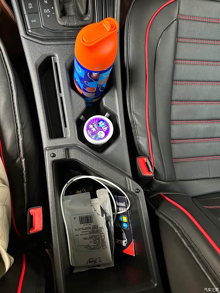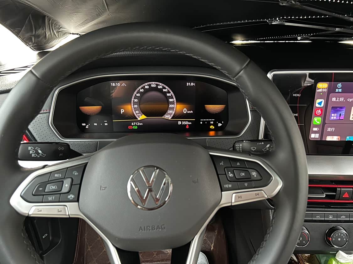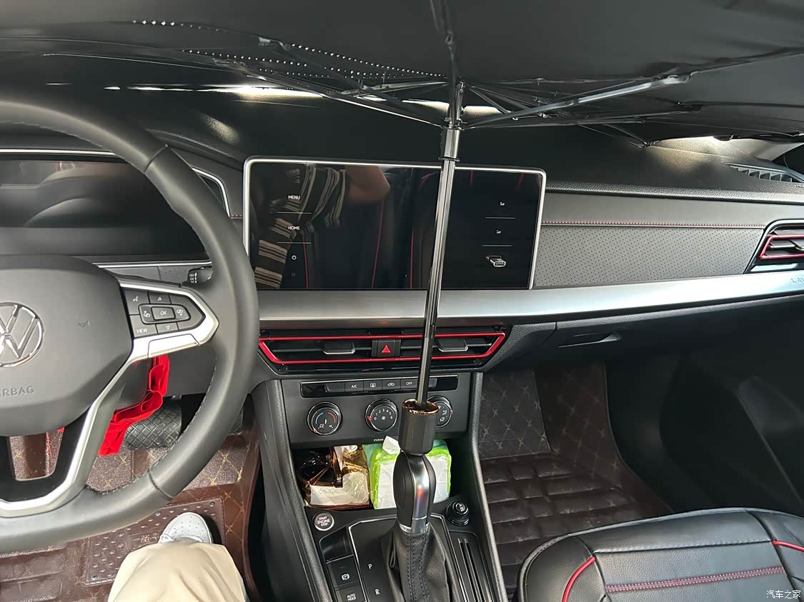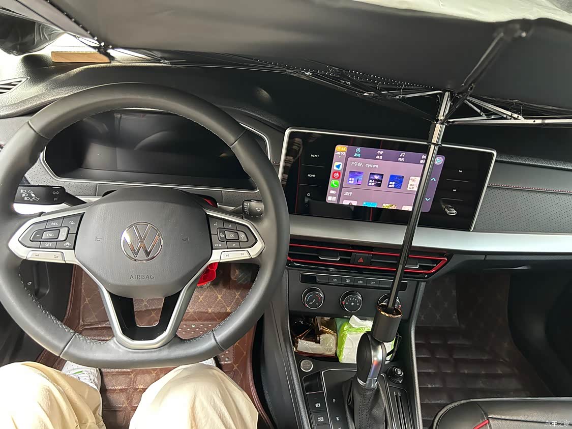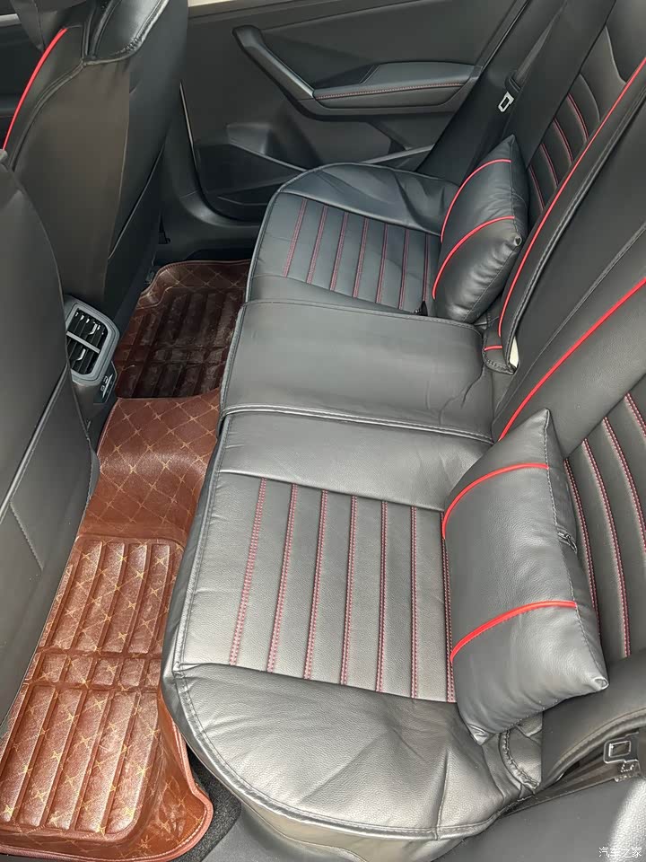 我对大众的内饰一向不抱有期望,如图所示,塑料感挺严重的,中控屏幕的公摊面积很大,座椅也不是真皮的,照片是我花150块钱买的全包坐垫。