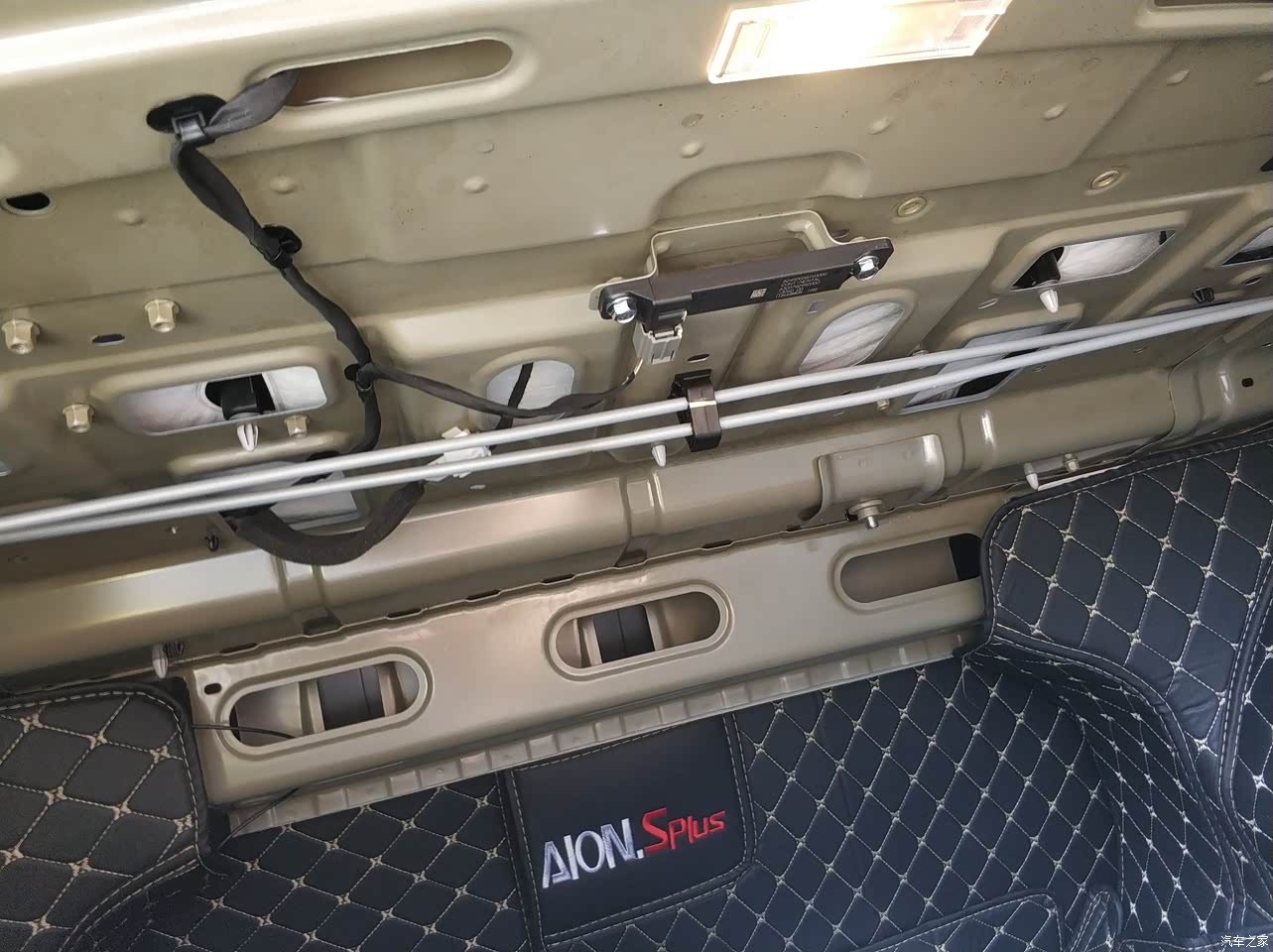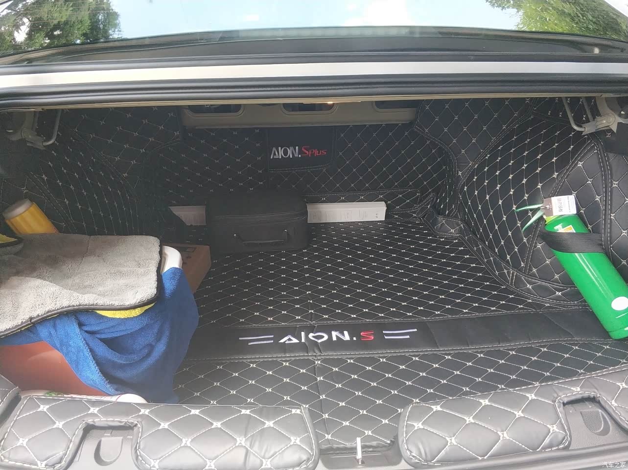 后备箱可以放三个中等型号的行李箱,而且两面的侧位都可以放小东西。我是装了全包尾箱垫,两面可以有捆绑的东西。顶部有一金属键需要小心,比较容易割手。 由于新能源大部分没备胎,全是补胎液,可以凑合用。
