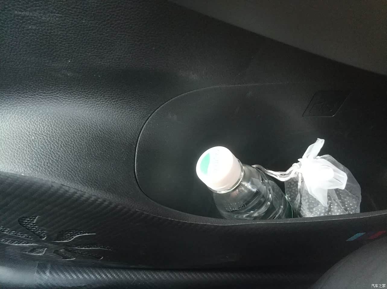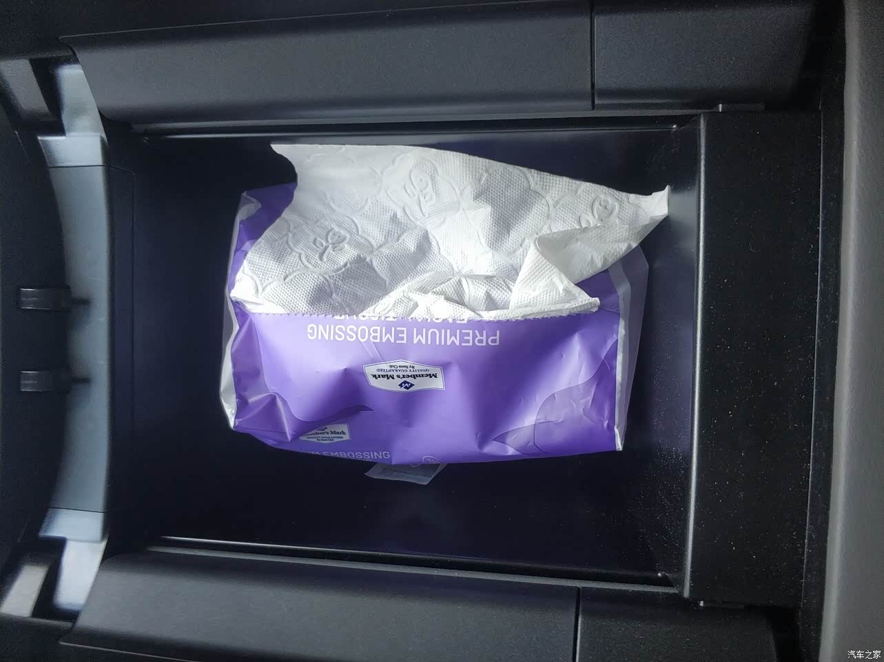 门板储物格可以放两瓶矿泉水是没问题的,前排座椅后面居然有两个储物袋,这点确实不错,但是我做了防踢垫,所以就只能用一个了。 中央扶手箱里面的空间还是可以接受,放点纸巾盒也没多大问题。 两个杯架的设计也是很不错。