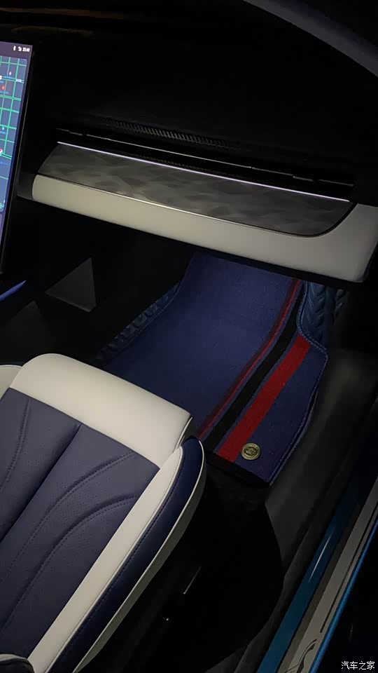 车内采用了简洁的T型布局,三幅式平底方向盘,同时怀抱式的设计营造了不错的氛围感。两块大尺寸显示屏依靠强大的车机系统基本可以解决车内的全部操作,而且内饰对比了黑色,综色和蓝白,选了蓝白,老婆又去做了个同款同色系脚垫 ,内饰老婆也是十分满息 ,她觉得习惯就好 配上自己加的蓝色脚垫,蓝白内饰,满意度十分。