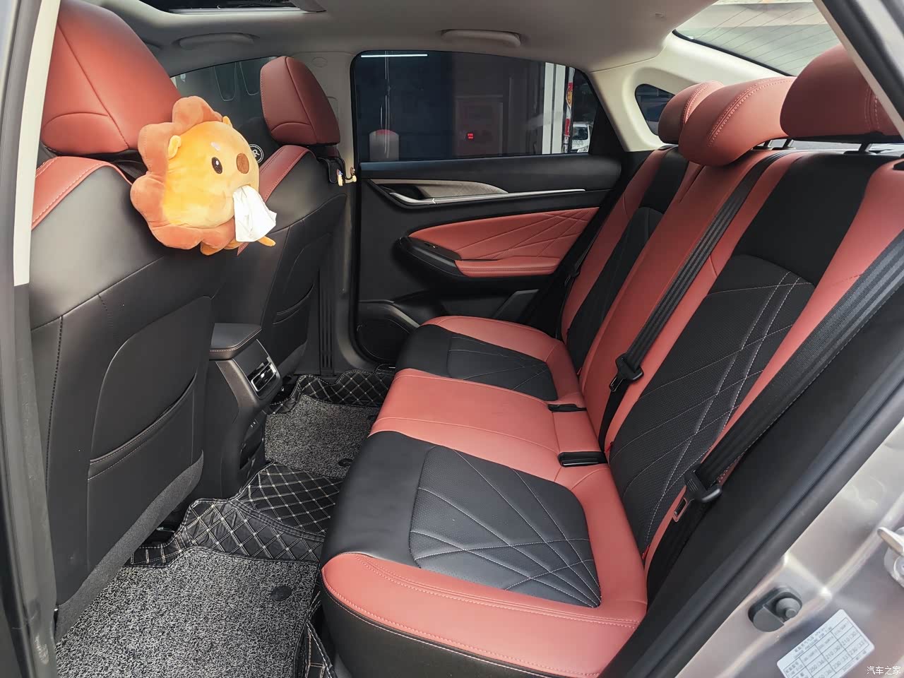 红黑内饰,还是很高级的。座椅皮质(还是仿皮不太懂这个)看起来很有质感又不显得老气。乘坐还是很舒服的。后排中间座位有点凸起,没有俩边舒服。另外电子屏,360影像,电子档杆这些都齐全。