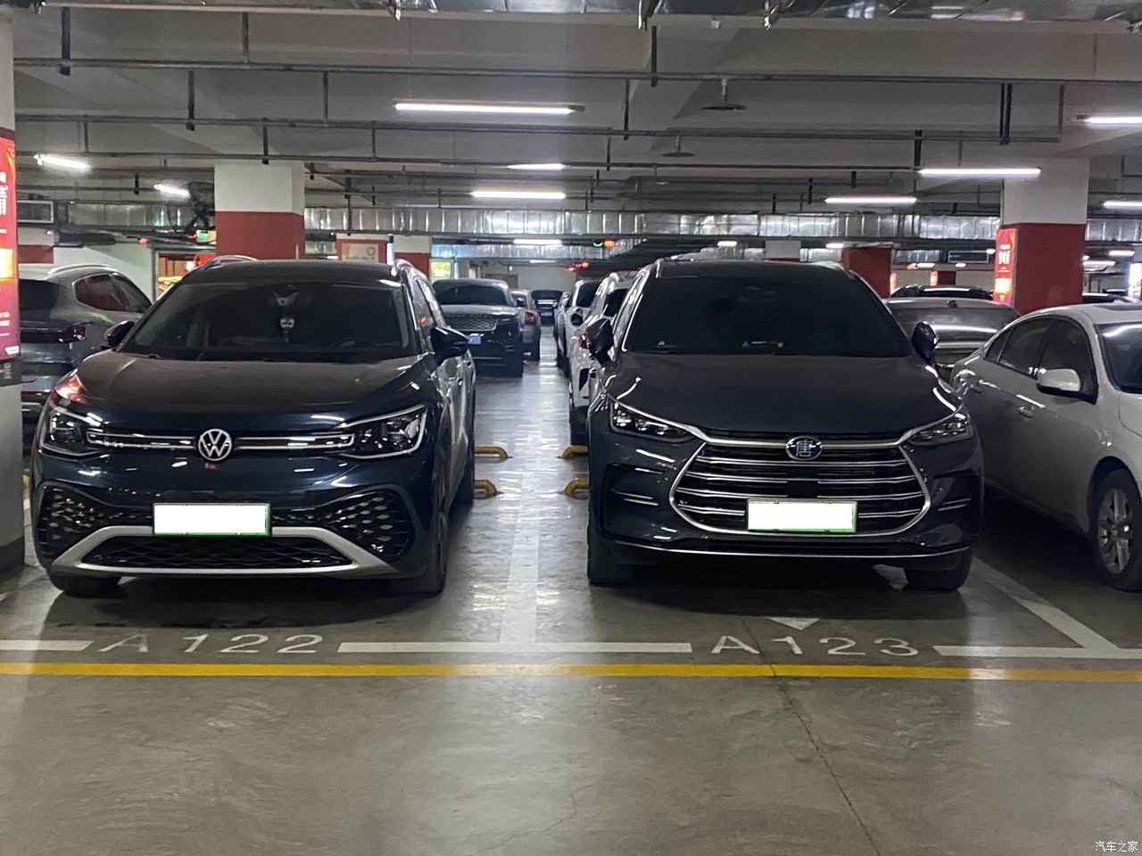 也没对比过别的电车,恰好商场和一台比亚迪唐停在一起,比亚迪唐西安的比较锐利,ID6则显得敦实些。