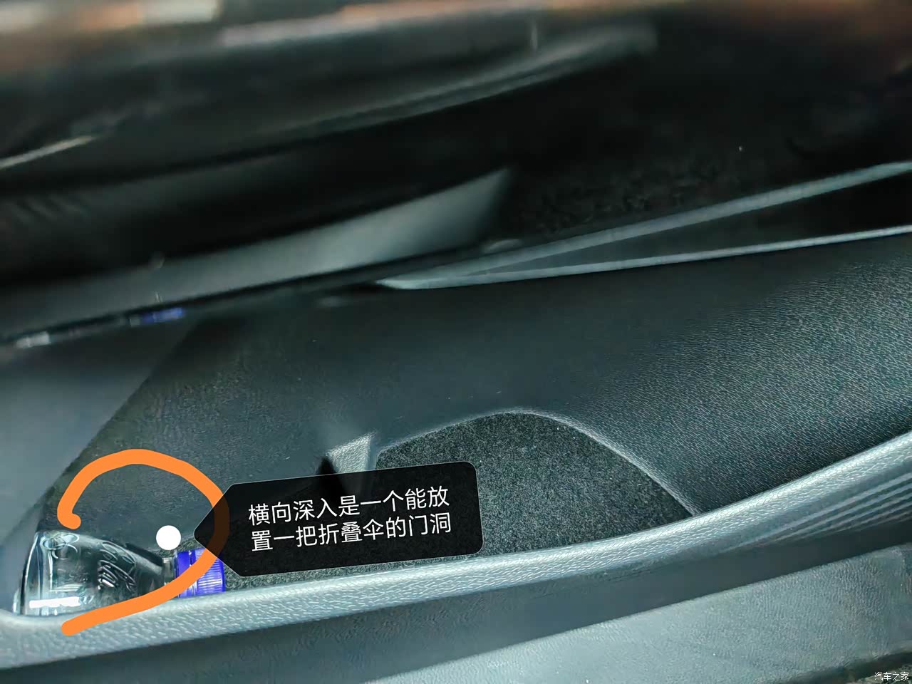 门板储物格有一个亮点,很多车主可能还不知道,储物格沿着门后方有一个类似于门洞,日常放置一把伞,只有伞头露出,这个门洞是很实用的。扶手箱空间很充足。