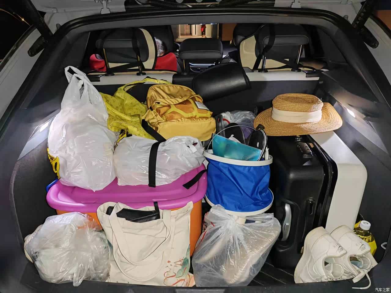 车内空间是我非常满意的一个地方,空间亮点在于,4米6的车身,但内部空间设计感觉像一辆B级甚至C级车的空间,后备箱空间非常大。。我身高1.72m,坐主驾驶位头部空间、前后空间仍然非常宽敞,1.8的朋友试坐后表示仍显空余。手套箱日常放置了车辆说明书、保险单等,还常备一副墨镜,一包百支装的口罩,有些微空余。不足之处在于扶手箱下面,主驾与副驾之间存在一个空洞位置,厂家没有利用起来,车主可以买个置物盒,日常放包纸巾或者一些小物品是可以的。后排中间不凸起,放置一个安全座椅,平板电脑置于主驾驶位后部,两个崽崽凑一起看平板,仍有足够观看距离可以确保不伤视力。对于我们四口之家来说,空间非常充足。后备厢也是一大亮点,车辆自带的置物板卸下之后,空间是有点惊人的,非常能装,七月一次旅行,我在后备厢放了一个28寸行李箱、一个35L和一个45L收纳箱,两箱矿泉水、睡袋一个,另外便携式充电枪、赶海全套工具、风筝、三把大水枪、几大袋零食、一大袋鞋子...仍有许多空间剩余。