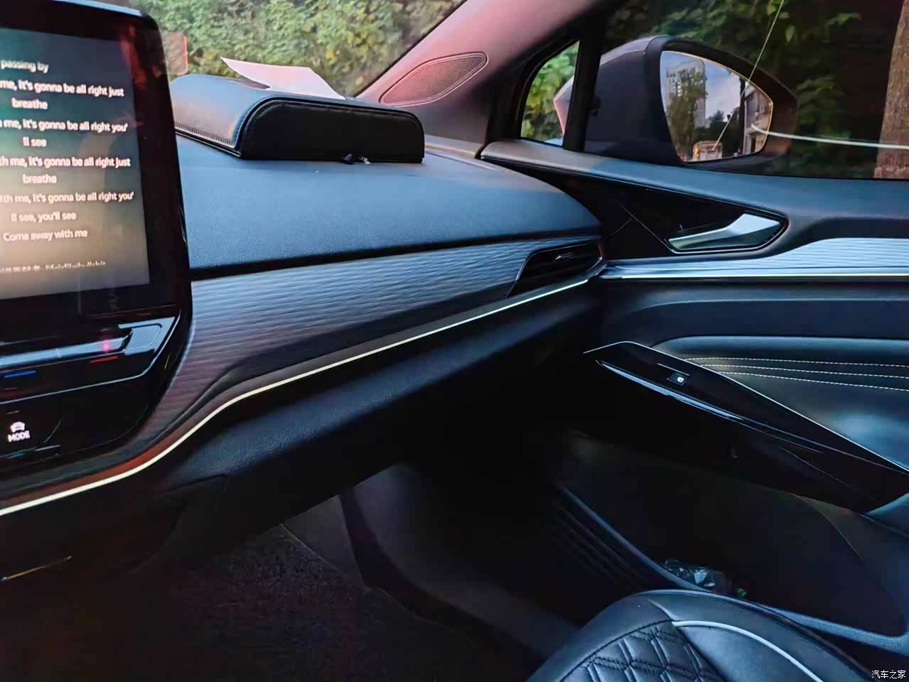 新车异味不大,内饰灰黑为主,耐看,做工方面使用的大量的塑料件(并非那种硬邦邦的廉价塑料件,类似偏软塑料件,谈不上高档,但也不调档次)和钢琴漆板,内饰搭配属中庸,仁者见仁,智者见智,不做过多评论。不太友好的地方是钢琴漆板容易划花。座椅个人感觉便硬,不能调节高度,坐下后会略显重心低,对身高不高的不太友好。乘坐感受不像SUV,更像轿车感受。空调效果非常好,冷风一开则来,夏日调节至26度以下,会显得有点凉。全景天幕,星夜躺车里看星空也是有一定意境的,但是全景天幕带来一个非常难受的事,烈日下面,虽然有遮阳帘,但是乘客头部仍会感觉很热,开启空调后,也是下半身凉,头部热的感觉(天幕通病,ID4至少有一个遮阳帘,后来自己在网上买了一个不影响遮阳帘开合的吸盘式遮阳垫,大大缓解了上热下冷的情况)。