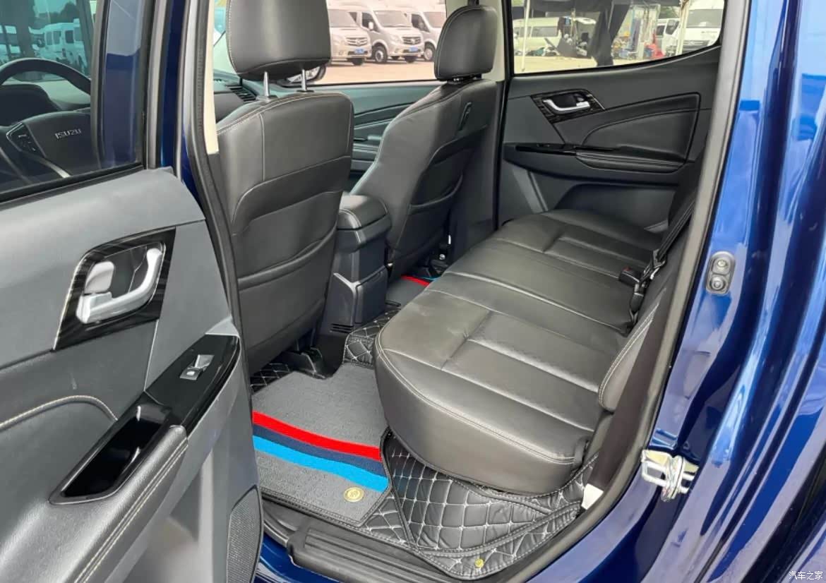 铃拓在保留了一个超大的货箱的同时留给前边的乘坐空间也是很充裕的,坐到前排不仅乘坐空间足够宽敞,而且视野还特别开阔,后排空间基本上就是够用的状态,地板中间的一点点凸起不足以影响到中间位置的腿部空间,后排的中间位置也贴心的给到了头部靠枕,还有两个隐藏的杯架,包括前排的储物空间也挺丰富的,所以我觉得这台车的空间实用性真的非常棒了。