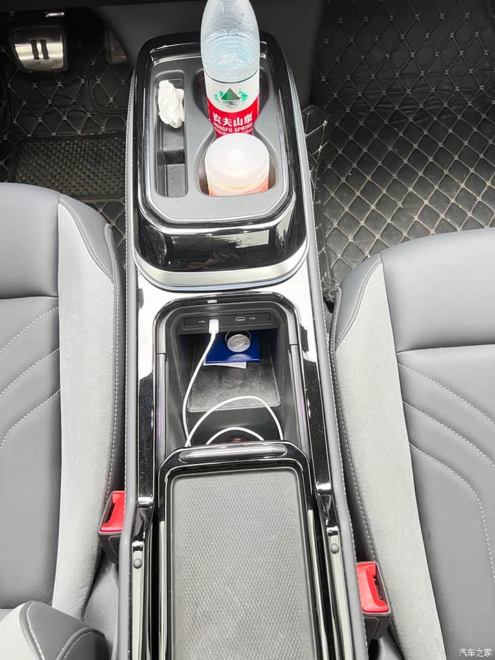 前排手套箱和扶手箱空间一般,没有什么新颖设计,前排两个水杯架和门上简单的空间设计 也比较粗暴,尤其是无线充电的位置,在手 扶箱里面,很不方便,基本没用过,设计不如4X。