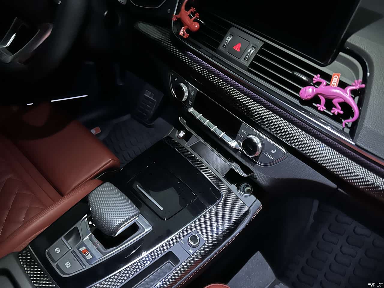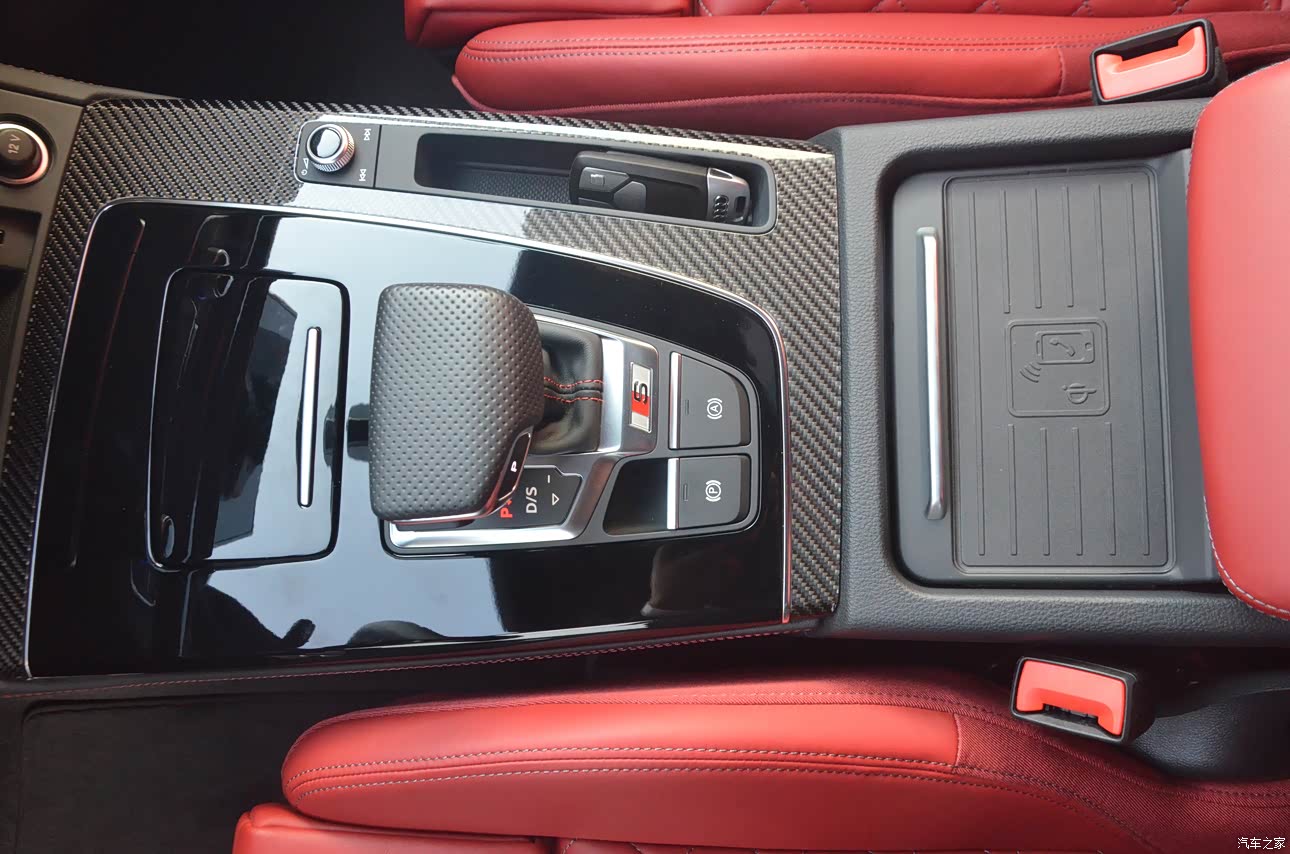 模拟声浪也还行,没用大家说的那么不屑。动态模式下只要你给油,推背感还是很强的,另外提速还是很猛,换挡非常平顺,没有奥迪7速变速箱常见的1、2挡换挡顿挫,这个还是归功于采埃孚的8AT变速箱,不到80km/h就可以直接到达8档了。因为选装了动态转向,再加上进口车的标轴,操控也非常好。出厂标配阿基波罗7N六活塞红色卡钳的刹车,前350mm,后330mm的刹车比较线性,后期计划改原厂阿基波罗9N的前400mm后350mm的刹车,据说会更线性。开空调风速调整在2档以上声音挺大,不过空调确实还比较给力,基本上1档就够用。