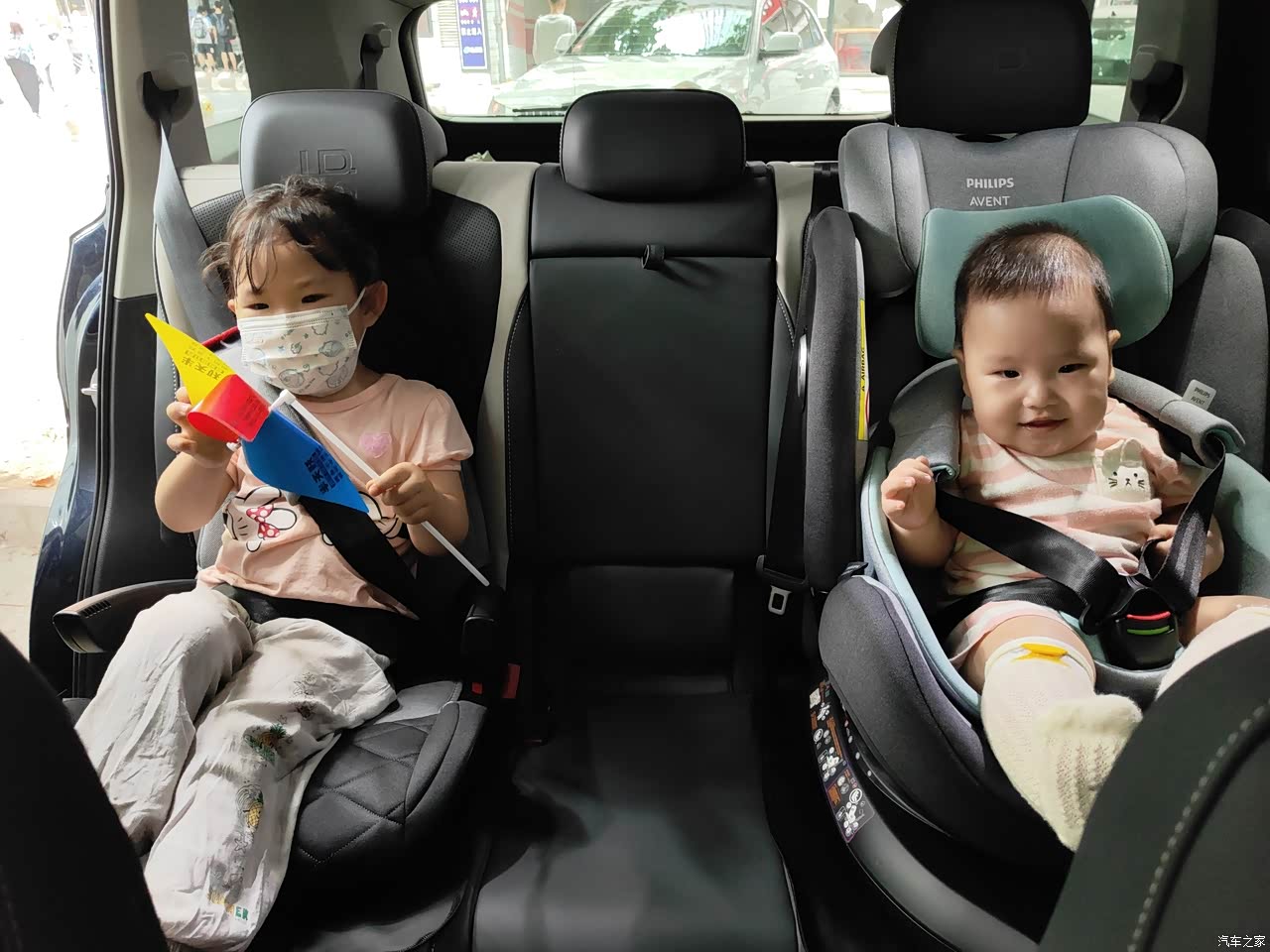 第二排放置的儿童座椅,第三排空间还是比较宽敞的,长途车舒适度也不错。 车内储物空间也比较多。