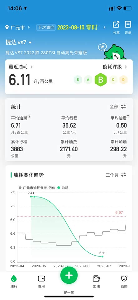 油耗是个意外,我想着这么大一个车,油耗肯定很高,即使是1.4T的应该也不会太低,但是综合来看,油耗真的太感人了,市区油耗7-8之间吧,红绿灯少点的路也就6点几,也不算很高,高速就更省油了我,我有记油耗的习惯,所以这台车的油耗我非常满意